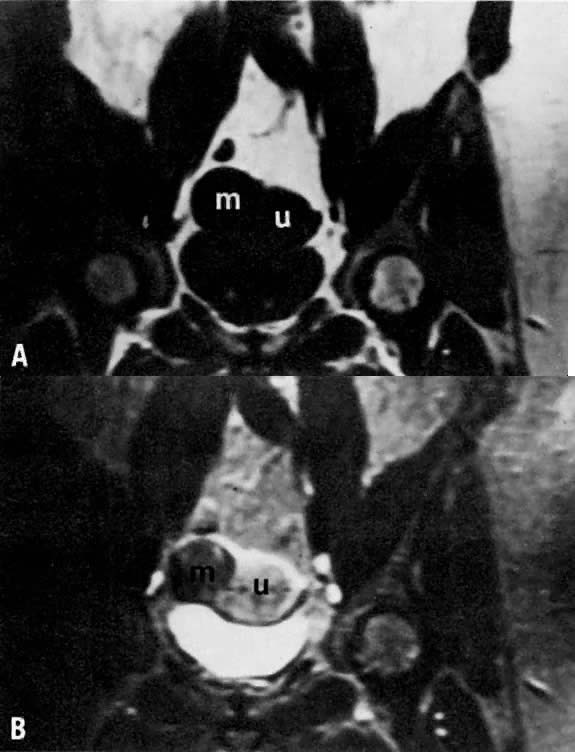 Uterus Normal myometrium in women not on oral contraceptives demonstrates an increase in T1 and T2 relaxation times in the secretory phase of the menstrual cycle. On more T2-weighted images, an increase in signal intensity is evident. The appearance of the myometrium in women on oral contraceptives is one of higher signal intensity on T2-weighted images, whereas the endometrial tissue is markedly reduced.12 Women taking higher doses of oral contraceptives demonstrate a larger degree of myometrial swelling and endometrial atrophy. It is thought that there is a greater water content in the myometrium during the mid-secretory phase and that there is an increase in the T1 and T2 relaxation times, resulting in increased signal intensity on T2-weighted images and decreased intensity on T1-weighted images. Knowing the normal myometrial characteristics of the uterus allows identification of pathologic alterations such as leiomyomas, a common gynecologic disorder (Fig. 4). Simple myomas tend to be of low signal intensity regardless of the pulse sequence used.13 They are usually surrounded by a smooth capsule also of low signal intensity. When compared with ultrasonography or hysterosalpingography, MRI is more accurate in detecting the presence, size, number, and location of leiomyomas.14 In patients with menorrhagia or infertility secondary to submucosal leiomyomas, MRI may be useful in optimizing patient management. In patients undergoing myomectomies to restore fertility, MRI before the procedure may help in planning the extent of surgery. Leiomyomas have various appearances depending on the presence or absence of calcium, hyaline or cystic degeneration, and hemorrhage.15 In the presence of cystic degeneration, the leiomyoma demonstrates increased T1 and T2 relaxation times, whereas the degenerative area itself has low signal intensity on T1-weighted images and high signal intensity on T2-weighted images. Hemorrhage within the leiomyoma, however, produces various appearances, depending on the imaging sequence used, and can make the diagnosis of leiomyoma more difficult.16 Several investigators have explored MRI of uterine sarcomas. Although MRI demonstrates the presence of these massive lesions and the degree of myometrial invasion, the overall findings are nonspecific, and differentiation from endometrial carcinoma is difficult.17, 18 Adenomyosis is a relatively common condition occurring in approximately 15% to 25% of women in the premenopausal period. It leads to progressively heavier and longer menstrual periods and is often associated with severe dysmenorrhea. The diagnosis is typically made after hysterectomy from pathologic specimens. MRI has been used to evaluate this condition.19, 20 On imaging, uteri with adenomyosis are enlarged and have smooth external configurations. Diffuse adenomyosis distorts the normal zonal anatomy of the uterus, causing enlargement of the junctional zone (Fig. 5). Although predominantly isointense with myometrium on T1-weighted images and decreased in signal on T2-weighted images, old hemorrhagic areas measuring a few millimeters in diameter are often seen as high-intensity spots on both T1-weighted and T2-weighted images. In contrast to leiomyomas, which have well-circumscribed margins, adenomyosis has irregular and indistinct margins because of its more invasive nature. Mark and colleagues reported on 21 patients with suspected adenomyosis.20 MRI correctly diagnosed all eight cases of adenomyosis subsequently confirmed by pathology. In a series of 93 patients with uterine enlargement, Togashi and associates used MRI to correctly diagnose the 71 cases of leiomyomas, 15 of 16 cases of adenomyosis, and all 6 cases of simultaneous involvement of both conditions.21 Because adenomyosis is often treated by hysterectomy but myomectomy may be sufficient for some leiomyomas, such imaging may be a very useful clinical tool for preoperative assessment and surgical planning. Endometrium MRI is particularly useful for assessing the endometrium, which can easily be identified and distinguished from the myometrium. Experience to date demonstrates that the endometrial tissue is approximately isointense with myometrium onT1-weighted images but appears higher in signal intensity relative to myometrium on T2-weighted images. The thickness of the endometrium in a normal menstruating female varies depending on the phase of the menstrual cycle, being thinner in the follicular phase and thicker in the secretory phase.22 Among patients who use oral contraceptives, the endometrial width is significantly smaller in both the follicular and secretory phases. Additionally, the junctional zone is also smaller in both phases of the menstrual cycle. Myometrial thickness tends to remain the same regardless of the phase of the menstrual cycle and the use of oral contraceptives. Such differentiation allows better assessment of the endometrium and may be particularly useful when Asherman's syndrome is suspected. The normal endometrial width varies between individuals, ranging from 1 to 8 mm, whereas the myometrial width varies from 1.5 to 2.5 cm. During the normal follicular phase, endometrial width can grow from 1 to 3 mm.22 MRI is able to define depth of myometrial invasion, tumor site, and cervical involvement in patients with endometrial cancer.23 Invasion of the myometrium is demonstrated by distortion of the junctional zone (Fig. 6). In patients with deep myometrial invasion, this low-intensity band is absent. MRI allows preoperative evaluation of the degree of invasion before a postoperative pathology assessment. Although MRI cannot diagnose endometrial cancer in situ (confined to endometrium), it is 92% accurate in the overall staging of endometrial carcinoma.24 The overall accuracy in demonstrating depth of myometrial invasion ranges from 71% to 86%.24, 25, 26, 27, 28, 29 Cervical involvement has been evaluated by Powell and colleagues, who correctly detected cervical involvement in 1