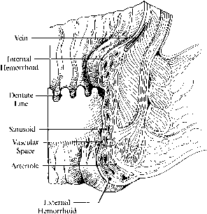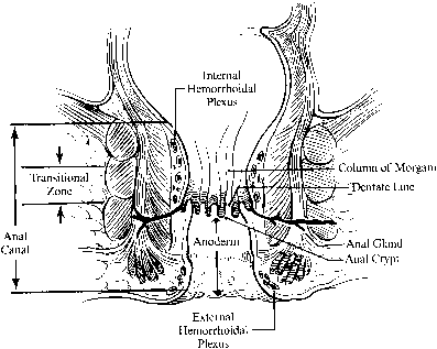 Symptomatic hemorrhoids are a common problem, believed to affect close to 25% of the American population.1 Most commonly occurring in the fourth to sixth decades, hemorrhoids may affect patients of all ages. They may be exacerbated by the hormonal changes of pregnancy, and may or may not resolve postpartum. Hemorrhoids are vascular cushions that become congested with increased anal, rectal, and abdominal pressures. They are ubiquitous in the general population and the degree to which they cause symptoms depends on the integrity of their supporting connective tissue framework. Hemorrhoids are classified as internal (above the dentate line and covered by anal mucosa) or external (below the dentate line and covered with anoderm or perianal skin) (Fig 4). On physical examination, they are typically located in the right anterior, right posterior, or left lateral position. Internal hemorrhoids usually present with bleeding associated with defecation and a sense of fullness from prolapsed tissue, which may require manual reduction. Pain is present only if an external hemorrhoid is thrombosed. Acute hemorrhoidal prolapse can be exquisitely tender, producing irreducible edematous tissue. Pressure necrosis, ulceration, and secondary infection can occur. Differential diagnosis includes painful bleeding from an anal fissure, full-thickness prolapse or procidentia, anal skin tags, and thrombosed external hemorrhoids. Internal hemorrhoids are classified into four categories. First degree hemorrhoids project into the canal and cause bleeding, but do not prolapse. Second degree hemorrhoids prolapse, but spontaneously reduce back into the canal. Third degree hemorrhoids must be reduced manually, and fourth degree hemorrhoids are irreducible. Treatment for hemorrhoids ranges from dietary and lifestyle changes to surgical excision, and depends on the severity of symptoms and response to conservative management. For mild to moderate symptoms, a high-fiber diet and bulk dietary supplements can help alleviate pressure and bleeding. Patients should be encouraged to drink water and defecate without delay at the urge sensation. Several procedures have been developed to fibrose the hemorrhoid tissue onto the underlying internal sphincter, thus restoring support for these vascular cushions and thereby preventing prolapse. When dietary and lifestyle modifications fail to reduce symptoms, sclerotherapy, rubber band ligation, and coagulation techniques may avoid surgical hemorrhoidectomy in up to 80% of patients with first and second degree internal hemorrhoids. Sclerotherapy is effective in 60% to 80% of first and second degree internal hemorrhoids. It can be performed easily in the office and is relatively painless. Sclerosing agents, such as quinine and urea or 5% phenol in vegetable oil, are injected at the base of the hemorrhoid above the dentate line. Rare complications include sloughing of the mucosa, reaction to the injectate, and secondary infections. Sclerotherapy is not as effective on large prolapsing hemorrhoids. Rubber band ligation of first and second degree hemorrhoids is effective in 65% to 75% of patients.2 Although less effective with third degree hemorrhoids, it can still be considered if one is attempting to avoid surgery. Banding around the base of the hemorrhoid causes necrosis and sloughing, and subsequent ulceration and fibrosis of the mucosa fix the tissue to the underlying sphincter muscle, preventing sliding of the anal mucosa. Banding is a simple procedure that can be performed in the office setting, and is relatively painless if performed properly. Common complications (less than 5% of patients) include bleeding, secondary infection, and pain if the band is placed too close to the dentate line. Despite rare reports of sepsis, rubber band ligation is one of the most common modalities for treating hemorrhoids. Infrared photocoagulation transmits infrared radiation and coagulates the mucosa, with results similar to banding and sclerotherapy. If done properly, it also is relatively painless and complications are minimal. Laser photocoagulation offers no advantage over other treatment modalities as it is expensive and carries a greater risk of complications from unrecognized deep tissue destruction.3 Electrocoagulation employs thermal injury to fibrose the hemorrhoidal tissue. Bipolar electrocautery employs similar instrumentation as the endoscopic devices and can be applied through an anoscope. Direct current electrotherapy requires more time and discomfort, but has shown better results in treating fourth degree hemorrhoids.4 A heater probe modified for use through an anoscope also shows good results with first and second degree hemorrhoids, but requires interval treatments. Reducing increased anal sphincter tone, and thus preventing engorgement of the vascular cushions, is the theory behind anal dilation and sphincterotomy. Manual dilation traumatically disrupts fibrotic bands and sphincter muscle fibers that contribute to increased anal tone. The procedure must be done under anesthesia, and while having success rates comparable to other nonoperative treatments for patients with high intra-anal tone, it carries almost a 10% complication rate. Complications include mucosal tears, prolapse, and incontinence. Surgical sphincterotomy also reduces high canal pressures, but is usually performed in conjunction with other procedures and is generally not performed as the sole treatment modality for hemorrhoids. The internal sphincter is partially divided under direct visualization, thus reducing anal pressure in a more controlled and predictable fashion than anal dilation. Surgical hemorrhoidectomy is indicated for grade 3 and 4 hemorrhoids and for patients with grade 1 and 2 hemorrhoids who have failed conservative management. One or all three hemorrhoidal complexes can be removed, generally in the operating room under local anesthesia. Hospitalization can be avoided for many patients. The swelling