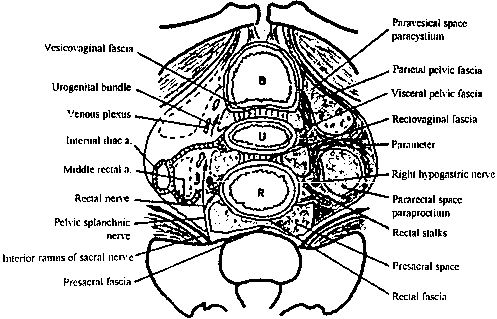 The anal sphincter is composed of two muscles. The internal sphincter is involuntary and is a continuation of the circular smooth muscle of the rectum. The external sphincter is a continuation of the striated muscle of the puborectalis muscle. The anorectal ring is a muscular structure at the junction of the anal canal and the rectum. It includes the puborectalis sling and upper portions of the internal and external sphincter (Fig. 2). Division of the anorectal ring results in incontinence. Blood is supplied to the anorectum via the superior hemorrhoidal artery (branch of inferior mesenteric artery), middle hemorrhoidals (branch of hypogastrics), and inferior hemorrhoidals (branch of pudendal artery). The anoderm and perianal skin are the only areas with somatic innervation. The upper anal canal and rectum are insensate. The fascial compartments surrounding the rectum are complex but clinically important. The rectal fascia propria surrounds the rectal wall and envelops the neurovascular supply and lymph nodes to the rectum. In women, the anterior rectovaginal fascia attaches to the vagina, forming the pouch of Douglas at the level of the superior vaginal recess. Relaxation of this fascia contributes to rectoceles and posterior support defects. Posteriorly, Waldeyer's fascia covers the presacral space. Laterally, the visceral pelvic fascia surrounds the mesorectum, is fixed superiorly to the internal iliac artery and hypogastric plexus, and forms the lateral rectal stalks (Fig. 3).