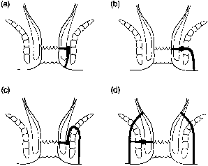 The internal opening usually can be identified during anoscopy. Probing of the internal opening should confirm its passage to the secondary opening, but reverse probing should be performed cautiously to prevent inadvertently creating a false passage. Once the tract is identified, its relationship to the sphincter will determine treatment (Fig. 8). Most commonly, an intersphincteric fistula is found. Transsphincteric fistulas are sequelae of ischiorectal abscesses. Suprasphincteric fistulas originate at the dentate line but course in a cephalad direction above the sphincter mechanism before turning caudally to exit on the perianal or gluteal skin. Extrasphincteric fistulas usually arise from the rectum above the anorectal ring and may be associated with foreign bodies, Crohn's disease, or malignancy. If the tract pathway is not easily determined, proctosigmoidoscopy may help. Barium enema, fistulograms using radiographic contrast material, endoscopic ultrasound, MRI, or CT may also be useful. Colonic, small bowel, and urethral fistulas can occur in an identical fashion, underscoring the importance of identifying an internal opening in the anal canal. Differential diagnosis also includes hidradenitis, pilonidal disease, and infected sebaceous cysts or Bartholin's glands. These entities will not have internal openings in the anal canal. Treatment of fistulas must ensure that healing occurs from the base of the surgical wound to avoid fistula recurrence, while preserving normal sphincter function. Superficial fistulas may be treated by fistulotomy. The tract is exposed, débrided, and left open for the defect to heal secondarily. Marsupialization of the skin edges can be performed to prevent early closure. For higher fistulas that encompass the external sphincter, fistulotomy will cause incontinence; therefore, a staged procedure is performed. Most commonly a Seton drain is placed (Fig. 9). A rubber-band drain or heavy silk suture is placed through the fistula tract and secured, maintaining patency of the tract while promoting fibrosis. At intervals, the Seton is tightened, allowing the deeper portion to heal while maintaining drainage. Gradual fibrotic repair maintains the integrity of the external sphincter. Treatment of large complex fistulas, such as horseshoe abscesses in the supralevator anal space, may require a combination of staged fistulotomies, and Seton or Penrose drains; alternatively, a mucosal advancement flap may be used to close the internal opening. Fibrin glue has been used to treat fistulas once the tract has been curetted and local sepsis treated. Success rates of 60% have been reported; however, fistulas secondary to inflammatory bowel disease are more likely to recur. The best results have been noted in simple fistulas, which also are the easiest to treat surgically; therefore the role of fibrin glue is controversial.12 Recurrence of fistulas varies, but approaches 18%,13 and occurs within 2 years in 90% of patients with recurrence.14 Most commonly, recurrence is attributable to misidentification of the primary opening, but can also be attributed to failure to expose the entire fistula tract, and early closure of the superficial tissue. Patients with active inflammatory bowel disease will also have a high recurrence rate. |