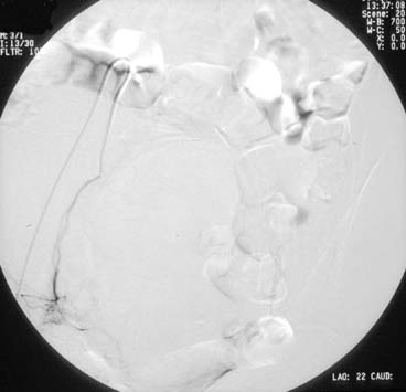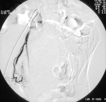 Transcatheter arterial embolization has recently been proposed as a definitive nonsurgical method for the treatment of symptomatic uterine fibroids. The use of transcatheter arterial embolization in obstetrics and gynecology is a well-established procedure. This procedure has been used extensively for hemorrhage from complications of pregnancy, surgical procedures, and pelvic carcinoma. In the early 1990s, Jacques Ravina and associates began using uterine artery embolization as a preoperative adjunct to decrease blood loss at myomectomy.25 In addition to reduced operative and postoperative blood loss, they noted that the uterine fibroids decrease in size and that women who had been treated for acute life-threatening bleeding also had resolution of their bleeding symptoms. Subsequently, this group treated 16 patients who were considered at too great of a surgical risk for hysterectomy with uterine artery embolization alone.25 Fourteen of the 16 patients (87.5%) were able to avoid any subsequent surgery. Uterine volume decreased an average of 36% in those patients available for follow-up with ultrasonography. The authors concluded that uterine artery embolization was a definitive procedure for symptomatic fibroids equal to currently available surgical methods. Biologic Mechanism of Uterine Artery Embolization of Fibroids Once embolic material is injected into the uterine arteries, it is carried along by blood flow to smaller and smaller branches. When enough embolic material is present to significantly slow blood flow in an arterial branch, clotting occurs. As smaller arteries clot, the flow in feeding arteries also slows, and they also clot. The flow of blood per unit volume of tissue is generally greater to the uterine myometrium than to fibroids. Consequently, more embolic particle will flow to the myometrium than the fibroids. Because of the extensive collateral blood supply to the uterus, occlusion of one uterine artery dose not produce significant ischemia of either fibroids or myometrium. Once both uterine arteries are occluded, both myometrium and fibroids become ischemic. The resultant hypoxia triggers recruitment of other collateral blood flow from the ovarian arteries and other collateral vessels. Generally within 24 hours, enough blood flow has been established to relive most of the ischemia to the uterine myometrium. Although the mechanism is somewhat unclear, myometrium appears to be much more tolerant of the ischemic produced by uterine artery embolization than fibroids. There is speculation that fibroids may be less able to lyse clots in their feeding vessels, less able to recruit additional blood flow, or may be inherently more susceptible to hypoxia than myometrium. As result, fibroid tissue dies while myometrium is spared. The resulting decrease in volume of any particular fibroid is dependent on the proportion of the fibroid that is made up of living tissue and the proportion that is nonliving degenerated tissue. Procedure of Uterine Artery Embolization Uterine artery embolization is performed in an angiographic suite using fluoroscopic guidance. The suite is usually located in a hospital, but the procedure has been performed in outpatient surgery centers. The procedure is usually performed with the patient under conscious sedation rather than general anesthesia. The procedure begins with the percutaneous puncture of either the right or the left common femoral artery. After the area of the groin overlying the planned puncture is anesthetized with local anesthesia, the common femoral artery is punctured with an 18-gauge needle and a guidewire placed into the artery. The needle is then replaced with a sheath through which catheters may be placed into the artery. A pelvic arteriogram is generally performed to delineate the arterial anatomy. Embolization of the uterine artery contralateral to the access site is usually attempted first. A catheter is directed over the guidewire, up the external iliac artery, to the bifurcation of the abdominal aorta. Using a steerable guidewire, the catheter is directed down the common iliac artery and then down the hypogastric artery and into the origin of the uterine artery. Angiography is used to aid in guiding the catheter into the proper position (see Figs. 1 and 2). Embolic material is mixed with contrast material and injected. Repeat injections continue until blood flow significantly slows or stops (see Fig. 3). The catheter is then withdrawn and the procedure repeated on the ipsilateral uterine artery (see Fig. 4).