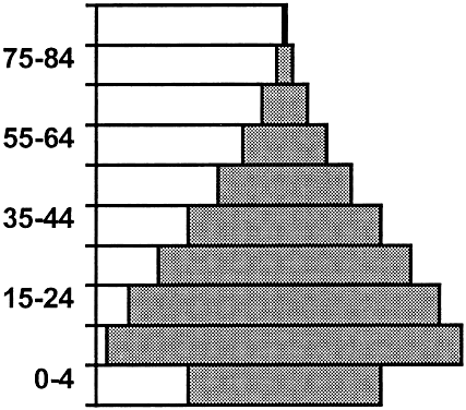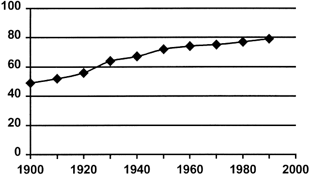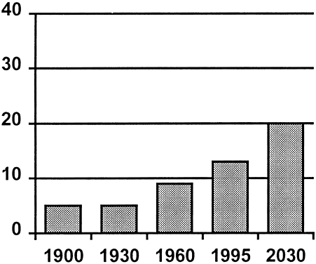 An increasing proportion of the population is living beyond 65 years of age. In 1900, only 5% of the population was older than 65.1 In the year 2030 it is projected that nearly 20% of the population will be older than 65 (Fig. 1).2 Life expectancy curves for women indicate a remarkable improvement in life expectancy from 51 years in 1900 to 80 years in the year 2000 (Fig. 2). The curve gives a false impression that only in this century have women begun to outlive their reproductive function; however, the figures depicting the distribution of the population in the years 1900 and 1995 illustrate the fact that the low average life expectancy in 1900 was the result of the numerous early deaths in infancy, childhood, and young adulthood (Figs. 3 and 4).2,3 Because many of these deaths have been eliminated by advances in health care, a greater proportion of those born now live a long life. Reducing infancy and childhood deaths has dramatically increased the calculated life expectancy of the U.S. population. This phenomenon has been referred to as rectangularization of the survival curve.