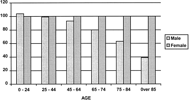 Men and women do not have the same life expectancy. In 1994, male life expectancy in the United States was 72.3 years, and female life expectancy was 79.0 years.4 The gender discrepancy is even greater between African-American men and women (Table 1). Life expectancy around the world is greater for women than for men in all but a few Third World countries. In the United States, the number of men per 100 women older than 65 years of age has gone from approximately 90 in 1950 to 69 males per 100 women older than 65 in 1995.5 There are a few more male babies than female babies born each year, and below the age of 14, there are approximately four more males for every 100 females. That number has been relatively constant for the past 40 years.6 After age 14, the male death rate is higher than the female death rate, leading to a marked imbalance between the sexes older than 75 years (Fig. 5). As the elderly become an enlarging proportion of the population, concerns arise regarding issues such as quality of life, health status, and the problem of chronic ailments and disabilities. The economic burden of poor health will be another area of concern for individuals and for society as more people live long enough to acquire limitations. TABLE 1. Life Expectancy at Birth, 1994