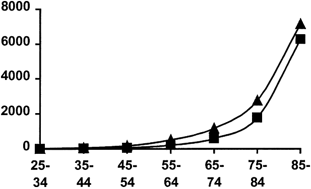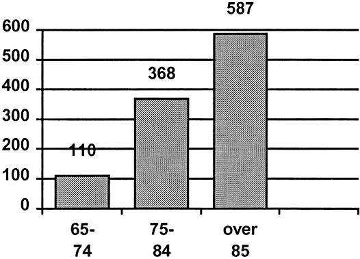 One measure of quality of life is the percent of the population able to live independently compared with the percent requiring a nursing home facility. Over the age of 65, there are 1,065,800 women in nursing homes.7 That figure represents about 5% of the women older than 65. The number rises sharply per decade (Fig. 6). Within the nursing homes, 75% of the residents require assistance with dressing, 70% cannot walk independently, and more than 50% have a continence problem with bowel or bladder.8 Incontinence and propensity to fall are major reasons for placement in a nursing home. These figures regarding impairment do not include the women receiving assistance in their own home. Among the noninstitutionalized, limitations of activity are reported in a more generic fashion. In order of increasing limitations, these are the categories: limited but not in a major activity; limited in amount or kind of activity; and inability to carry on major activity (i.e. bathing, dressing, shopping, or eating). The older the population, the greater the percent with limitations. In 1994, approximately 12% of the noninstitutionalized women older than 75 were not able to perform major activity, and an additional 34% of that age group were split between the other two lesser categories of limitation.9 The absence of a spouse may contribute to the likelihood of a nursing home admission. In 1985, most elderly people admitted to a nursing home did not have a spouse. Only 16% of nursing home residents had a spouse compared with 44% of the functionally impaired elderly still living in the community.10 Data regarding the presence of living children do not support the theory that lack of living children contributes to nursing home admissions. Most elderly nursing home residents (63%) had living children. Even among residents older than 85 years, 69% had living children. Functionally impaired elderly African Americans are more likely to live with children than their Caucasian counterparts are. Among elderly nursing home residents, only 42% of African Americans had living children compared with 65% of Caucasians.11 Information regarding confounding factors is not available. It is unknown whether geographic availability of children, level of skilled care needed, or financial issues play a role in these data. About one third of Americans older than 65 who are living in the community are living alone.12 This represents about 8 million people, one half of whom are older than 75. Eighty percent of those living alone are women, and most are widowed. The longer life expectancy for women, coupled with the fact that they tend to marry older men, contributes to this imbalance. Many live in the same place they lived for years. Although 29% of those surveyed had no living children, most of those with children stayed in touch through weekly or more frequent visits or telephone calls. Mail was not a commonly used means of communication. Most thought they were doing well on their own.13 |