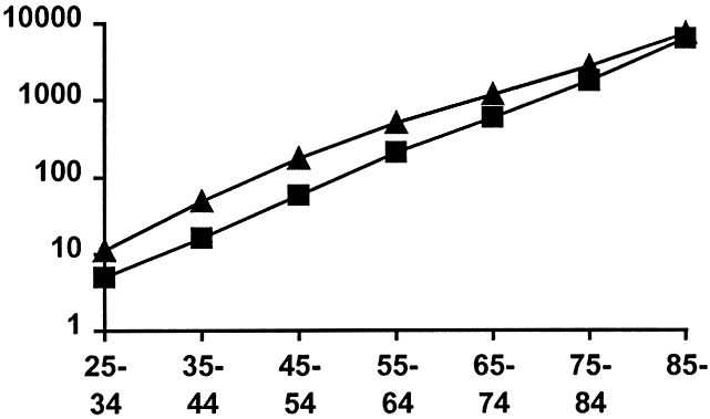 Among the elderly and among all ages, malignancy is the number two cause of death. It is a relatively close second for men but trails further behind heart disease in women (Table 2). For the first time since the 1930s, the American Cancer Society reported a decline in the total number of new cancer cases and a decline in the cancer death rate in the United States.26 Between 1991 and 1995, the overall death rate decreased 2.6%. For women, this included a 1.5% per year decrease in colorectal cancer deaths from 1991 through 1994 and a 1.8% decrease in breast cancer deaths. Although men are beginning to see a decline in death rates from lung cancer, the lung cancer death rate for women is continuing to climb. This point deserves attention, because lung cancer is one cancer that can be reduced by decreasing cigarette smoking. TABLE 2. Deaths From Heart Disease and Malignancy in 1995