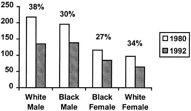 Heart disease in women has gained attention in recent years. For many years, most of the research on heart disease had been conducted with males, and it was not known whether these findings could be extrapolated to females. The number one cause of death for men and women is heart disease. More women die of heart disease than men: 374,849 women versus 362,714 men in 1995.19 In general, heart disease in males has an earlier onset, by approximately 10 years. Arithmetic graphs reveal almost parallel lines, with a steep rise after age 50 (Fig. 7).20 The later onset in women has been attributed to a protective effect of the female hormones, and accumulating data suggest that estrogen may provide cardiovascular benefits through a wide variety of mechanisms. Plotting the increase in myocardial infarctions on a semi-logarithmic scale yields a straight line, raising the possibility that heart disease is more related to age than to hormonal status (i.e., menopause). As age increases, the male and female death rates approach each other because of a subtle decline in the rate of increase for men (Fig. 8). A major healthy trend during the past 40 years has been a marked decrease in the rate of death from heart disease (Fig. 9). All Americans have benefited: male and female Alaskan Natives, African Americans, American Indians, Caucasians, and Hispanics. Women in particular have seen decrease from 234 deaths per 100,000 in 1950 to 100 deaths per 100,000 in 1995.21 No doubt many factors have contributed to this decline, including a decrease in smoking prevalence, control of hypertension, angioplasties, coronary artery bypass procedures, thrombus-dissolving treatments, cholesterol-lowering drugs, and fitness programs. Despite the decline in the death rate from heart disease and the attention focused on lowering cholesterol and blood pressure, obesity is increasing in the United States. In 1960, 25.6% of all women were classified as overweight. In 1990, 35.9% of women were classified as overweight.22 Overweight was defined as a body mass index of 27.3, the equivalent of a 5 foot 5 inch woman weighing 160 pounds. Among African-American women, 53% are classified as overweight using this definition (Fig. 10).23 Despite the increase in obesity, American women have managed to decrease their serum cholesterol from 222 mg/dl in 1960 to 204 mg/dl in 1990. This represents a decrease in the percent of the population with high cholesterol from 34.5% to 20%.24 The incidence of high blood pressure (defined as 140/90 mm Hg) has declined from 33.7% in 1960 to 20.8% in 1990. Among women 65 to 70 years old, the incidence of hypertension was 81.5% in 1960, compared with 60.8% in 1990.25 |