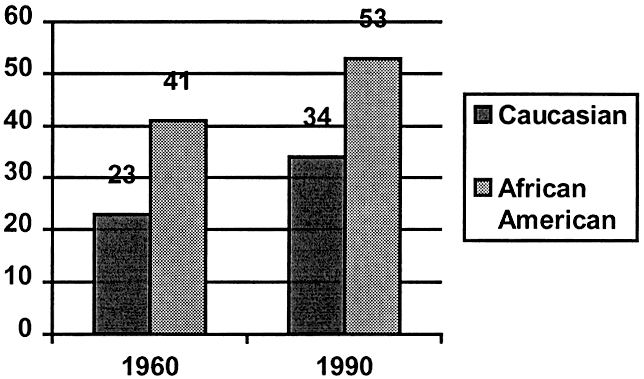 *After age 65 death from heart disease greatly surpasses death from malignancy. Smoking has declined overall from 42% of the population older than 18 in 1965 to 25% in 1993.27 In men older than 65, there has been a 53% decrease in the percent smoking (from 28% to 13%), and among women older than 65, the percentage has remained relatively constant at 10% during the past 30 years. The decline in lung cancer that would be expected from this trend has already been documented for men. In 1987, lung cancer surpassed breast cancer as the number one cause of cancer death for women. Even though there are more deaths from lung cancer, far more women get breast cancer than lung cancer. Estimates for 1998 indicate four times as many women will be diagnosed with breast cancer as will die from it (Fig. 11).28 An additional 30,000 women will be found to have carcinoma in situ of the breast. For those between 15 and 54 years of age, breast cancer is the number one cause of cancer death for women. For those between 55 and 74 years, cancer of the lung or bronchus results in more deaths than breast cancer, and for those older than 75, cancer of the lung or bronchus and cancer of the colon or rectum result in more deaths.29 The 5-year survival rate for breast cancer is 86% for Caucasians but only 70% for African-American women. For several cancers, including breast cancer, African-American women are experiencing a 10% to 15% lower survival rate.30 |