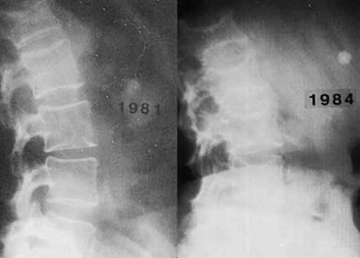 Osteoporosis is an insidious disease and often goes undetected until a painful compression fracture occurs. Only in hypoestrogenic female athletes and dancers may stress fractures be the first sign. Back pain is frequently the first complaint associated with osteoporosis; at first presentation, radiologic changes are usually not evident. A minimum of 25% to 30% of bone mineral content must be lost for osteoporosis to be diagnosed by routine radiographs (Fig. 3). Sudden severe pain may indicate vertebral collapse. The principal complications of osteoporosis include distal forearm fractures, vertebral compression fractures, and hip fractures. Distal forearm fractures (i.e. Colles' fractures) are the first to increase, with a 10-fold rise occurring in Caucasian women as they age from 35 to 60. Spinal compression fractures, the most frequently occurring of the osteoporotic fractures, may cause pain, loss of height, and postural deformities. Such fractures are 10 times more common in white women than in men, occurring in 25% of Caucasian women over the age of 60. The average postmenopausal woman shrinks approximately 6.35 cm. Some loss of height is secondary to narrowing of the disc space. Small vertebral fractures are responsible for anterior collapse of the vertebral bodies, leading to dorsal kyphosis (i.e. dowager's hump). Osteoporotic fractures of the femur occur later in life, usually at age 70 to 75. The incidence of hip fractures increases from 0.3 per 1000 to 20 per 1000 from age 45 to 85, with 20% to 25% of all women sustaining such a fracture by age 90. In 80% of the cases, osteoporosis is the cause. Fifteen percent of these women die within a 3-month period because of complications of the fracture, including pulmonary edema, myocardial infarction, and pulmonary embolism.66 Another 25% of these women suffer significant morbidity. Taking into account the significant morbidity, the direct and indirect costs of osteoporosis were estimated for 1995 to have been 13.8 billion dollars in the United States.67 Cortical bone predominates in the shaft of long bones, whereas trabecular bone is found primarily in the vertebrae, pelvis, and other flat bones, as well as the ends of long bones. Trabecular bone is more sensitive to factors that affect remodeling because it is metabolically more active than cortical bone. Vertebral fractures, Colles' fractures of the distal arm, and increased loss of teeth are seen with postmenopausal osteoporosis because the vertebral body, ultradistal radius, and mandible contain large amounts of trabecular bone. Trabecular bone loss begins at age 30 to 35, with a linear decrease of 1.2% per year. Although one series reported a similar rate of loss in postmenopausal and premenopausal women,68 most studies have shown a significant increase in bone loss after menopause. One study reported a 12% loss of density in the lumbar vertebrae 2 years after surgical oophorectomy.69 This accelerated phase of bone loss appeared to result from an increased rate of bone resorption relative to bone formation.70,71 This phase is more easily discernible in oophorectomized women, who have an abrupt loss of estrogen, than in women undergoing physiologic menopause, who have a gradual decline in estrogen levels. The loss of bone mass correlates with the duration of estrogen deficiency. When women of a mean age of 50 who had been castrated 20 years before were compared with women of a mean age of 70 who had undergone menopause 20 years earlier, the bone mass was similar in both groups, with a 15% to 28% loss of radial bone.72 The actual estrogen levels, the metabolic clearance rates, and the rates of conversion of androgen to estrogen appear to be of no value in predicting which women will have a more rapid rate of bone loss. Cortical bone loss begins at approximately age 40, at which time there is a slow rate of loss of 0.3% to 0.5% per year until menopause, when the rate increases to 2% to 3% per year. This rate continues for 8 to 10 years, at which point the slow loss rate is resumed.73–75 Consequently, there is a much greater loss of trabecular than cortical bone. The belief that estrogen deficiency plays a major role in bone loss is strongly supported by the high incidence of osteoporosis seen in untreated oophorectomized women and women with gonadal dysgenesis. The rapid bone loss seen in untreated women is prevented with the use of estrogen replacement.76 Increased urinary excretion of calcium and hydroxyproline is associated with estrogen deficiency, presumably because of an increase in bone resorption (Table 5).77 ERT reduces the rate of excretion of these substances to the range observed in premenopausal women. TABLE 5. Effects of Estrogen Decline on Bone Metabolism Acceleration of bone loss Parathyroid hormone (PTH) causes an increase in serum calcium by increasing bone resorption, increasing tubal reabsorption of calcium in the kidney, and producing the enzyme 1α-hydroxylase, which is needed to make the active form of vitamin D necessary for calcium absorption from the gut. Premenopausally, estrogen is thought to block the action of PTH on bone resorption, possibly by increasing calcitonin levels. After menopause, estrogen levels fall. It is believed that the actions of PTH are then less inhibited, leading to an acceleration of bone loss. There is decreased secretion of PTH, increased secretion of calcitonin, and impaired 1α-hydroxylase activity, causing a decrease in the production of 1,25(OH)2 vitamin D and diminished calcium absorption from the gastrointestinal tract. Estrogen receptors have been identified in osteoblastic cells in tissue culture.78,79 Although added estrogen increases secretion of alkaline phosphatase and α1-procollagen by such cells in vitro, it is not clear whether this is the mechanism by which estrogen affects bone loss. This is especially true in view of the diverse effects of estrogens on metabolic factors that can affect bone. Progesterone rece