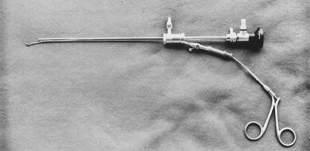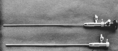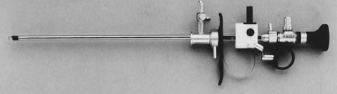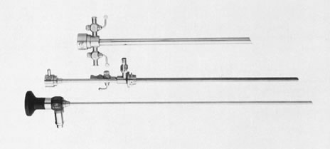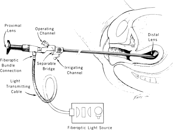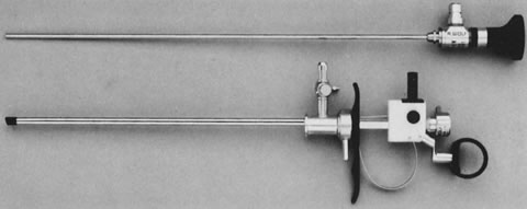 With the advent of medical fiberoptics, diagnostic tools for gynecologic endoscopy were augmented not only in intraperitoneal visualization by laparoscopy and culdoscopy, but also in the visualization of the interior of the uterus and tubal ostia. Hysteroscopy is the technique of visualization of the cervical canal and uterine cavity by means of an instrument that includes a metallic sheath and a telescope receiving light through a fiberoptic bundle from an external illuminating source. A solution or gas is used to distend the uterine cavity during the procedure. Hysteroscopy as a procedure dates from 1869, but only recently has it become a widely used technique. Maintaining distention of the uterine cavity has been difficult, and endometrial bleeding has obscured visualization. Since the work of Edstrom and Fernstrom in Sweden1 using dextran-70 (32% w/V) in dextrose or Hyskon (10% w/V) as a medium to distend the uterus, however, application of the improved technique has proved broad and promising. Development In 1869, Pantaleoni2 first performed hysteroscopy in a living patient when he used his “endoscope” for visualization of the uterine cavity, and chemically cauterized a polypoid growth in a 60-year-old woman with postmenopausal bleeding. The technique was largely forgotten. Interest was renewed by several investigators, especially Rubin,3 who in a 1925 study used carbon dioxide (CO2) for distention of the uterine cavity. In 1927, Von Mikulicz-Radecki and Freund4 introduced electrocoagulation of the intramural portion of the tubes. In the United States, Norment5 worked for more than 30 years with several models of hysteroscopes, including one with a water-rinsing system and one with a rubber balloon attached to its distal part and inflated with air. His results were not satisfactory, however. In 1962, Silander6 introduced a hysteroscope that had a latex rubber balloon attached to the distal portion for distention of the uterine cavity with normal saline instead of air. This provided acceptable visualization, but the uterine cavity remained inaccessible for biopsy or any other surgical intervention. In 1970, Edstrom and Fernstrom1 published their results with 32% dextran (molecular weight, 70,000) for distention of the uterine cavity. The use of 32% dextran allowed both excellent visualization and biopsy of lesions and surgical manipulation within the uterine cavity. Since then, several media have been used successfully for distention of the uterine cavity, such as 32% dextran, 5% dextrose (D5W), CO2, Ringer's lactate, and normal saline. Instruments and Equipment Hysteroscopic instrumentation consists of a telescope 2 to 4 mm in diameter, with Foroblique vision; a metallic sheath for the telescope and accessory channels to deliver the distending medium and introduce operating instruments; a connecting bridge with special channels to introduce manipulating instruments; a cold light fiberoptic bundle to transmit the light; an external light source for illumination; and when electrocoagulation is to be used, an appropriate electrosurgical source (Figs. 1 and 2).