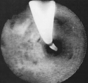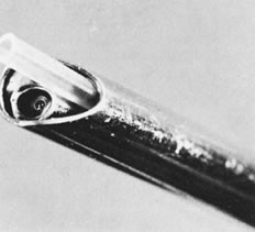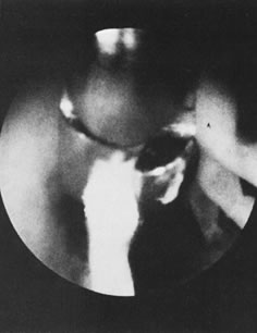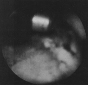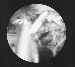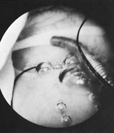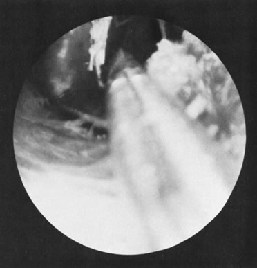 *Three patients each had two IUDs found within the uterine cavity. Valuable studies of tubal motility can be accomplished with open-ended catheters introduced into the tubal lumen (Fig. 26). Biochemical determination of the tubal milieu is of value in the investigation of human reproduction.11 The technique provides direct access to the uterotubal junction without invasion of the peritoneal cavity. Undoubtedly, the most promising application of hysteroscopy is tubal occlusion for sterilization purposes. However, surgical intervention within the uterine cavity must not be attempted until the clinician is experienced in intrauterine visualization and observation, especially at the uterotubal junction. The small area of manipulation and the fragility of the endometrial lining make extreme delicacy mandatory for the procedure to be successful and free of possible complications (Figs. 27 and 28).