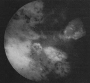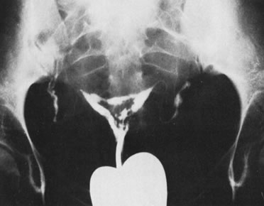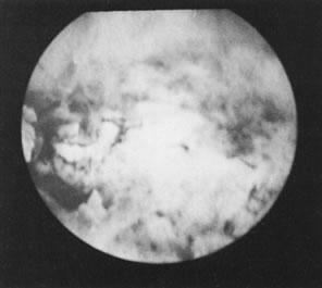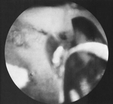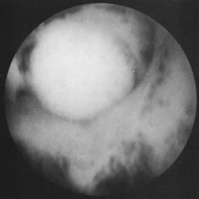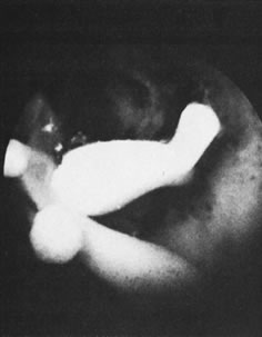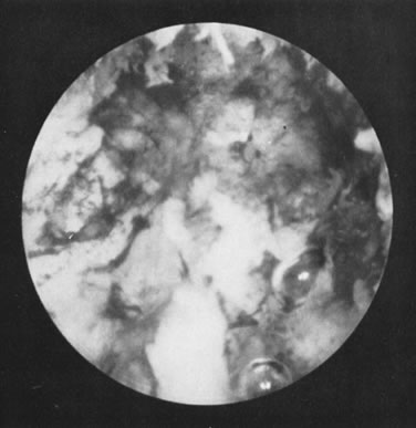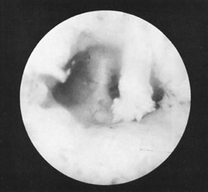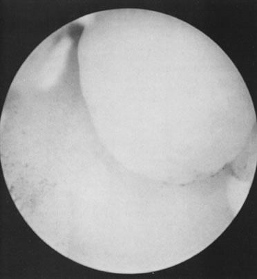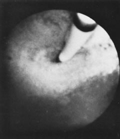 In some instances, when adequate visualization is impossible because of undue bleeding, clots, or excessive mucus and endometrial debris, it is advisable to irrigate the endometrial cavity under a low-gravity pressure system, collecting this material through a polyethylene tube large enough to avoid plugging Figs. 17 and 18).Uterine distention thereafter offers a better view. This is almost mandatory when foreign bodies are investigated or removed by this method.