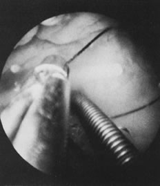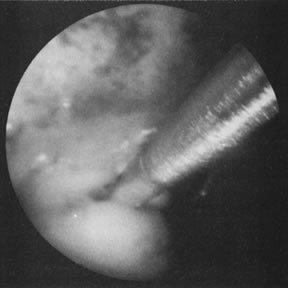 UTERINE SEPTA Uterine malformations resulting from partial or complete failure of the müllerian ducts to fuse or canalize may interfere with normal reproduction in 20% to 25% of patients afflicted with these conditions. Of these uterine abnormalities, a septate uterus is most often associated with reproductive wastage.30 The classic clinical picture is of repeated early-midtrimester pregnancy wastage, with signs of labor, including bleeding. This condition has traditionally been treated with abdominal metroplasty, with excision of the septum through a wedge uterine excision,31 or incision of the septum without excision to prevent reduction in size of the uterine cavity.32 Both operations require a laparotomy and division of the uterine corpus. There has been a revival of operative hysteroscopy for the division of uterine septa. Although this operation was originally reported by Edstrom33 in 1974, it was used only sporadically until recently. Daly and associates34 reported success with hysteroscopic metroplasty in 25 patients, with promising results. The operation is performed with concomitant laparoscopy to assess the external shape of the uterus and monitor the operation; recovery is relatively quick. Cyclic estrogens and progesterones are prescribed for 1 to 2 months, and patients are then allowed to attempt pregnancy. Delivery is vaginal, and cesarean section is reserved for obstetric indications. We have reviewed our experience during a 6-year period with 12 patients who had a symptomatic septate uterus and underwent hysteroscopic division of the uterine septum monitored by concomitant laparoscopy. The preoperative reproductive history included 41 pregnancies with only 3 viable deliveries. Perioperative prophylactic antibiotics were used, and estrogen and progesterone were also prescribed postoperatively. Of the 12 patients, 10 conceived within 1 year after therapy; 7 of these patients delivered a live infant at term. Two patients had a spontaneous abortion at 6 and 8 weeks after therapy, but their subsequent pregnancies were carried to term. Three patients are currently pregnant. A second hysteroscopic operation was performed in 2 patients because of a remaining septum observed at the posttreatment hysterogram. Conventional metroplasty requires major surgery and may jeopardize fertility because of subsequent pelvic adhesions. A longer postoperative interval is required before pregnancy can be established; moreover, cesarean section is needed. For these reasons, hysteroscopic division of the uterine septum is more appealing to patients and physicians; the low morbidity, simplicity, and encouraging pregnancy outcome with this operation make it the treatment of choice for a symptomatic septate uterus (Figs. 32, 33, and 34).35