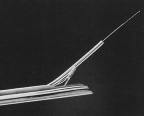 The hysteroscope is a modified cystoscope with a more circular sheath, in most instances, and with distal fenestration and a separable bridge. The procedure requires less illumination compared to laparoscopy because it has a viewing distance of less than 2 cm. Among the several previously mentioned media for distention of the uterine cavity, 32% dextran (molecular weight, 70,000; viscosity, 225 centipoise [cP] at 37°C) has the desirable properties of being viscid, optically clear, and not readily miscible with blood. It offers a high refractory index as well, and because its flow around the sheath is minimal, a smaller quantity is needed during the procedure; however, a practical and adequate delivery system is desirable. The instruments must be thoroughly washed in hot water immediately after the procedure is terminated to avoid possible damage to the lens system from hardened dextran. Normal saline (NS) requires specific pressure for distending the uterine cavity in each patient. It is simple to deliver, allows washing of the uterine cavity, produces little or no bleeding, and is readily available in any hospital or office setting. CO2 insufflation requires a special hysterosufflator to produce a pneumometra and to record intrauterine pressure and gas flow, which are necessary for safety and effectiveness. The hysterosufflator designed by Lindemann (Hysteroflator 1000, F.M. Weist K.G., 1 Berlin 30, Germany) electrically controls a continuous CO2 insufflation with a flow of 30 to 100 mL/min and an intrauterine pressure of 100 mmHg.7,8 Other machines digitally display those features (Storz, Wolf, Olympus). We use CO2 as a distending medium for office diagnostic procedures. D5W or D5NS and, in some instances, 32% dextran are used as distending media for operative procedures. When hysteroscopy is performed as an outpatient procedure, it may require a paracervical block tray, particularly for operative procedures. Paracervical block anesthesia is produced according to the individual practitioner's choice. A tray for proper preparation and draping of the patient and an external light source giving an illumination of 100 to 1000 W are needed. Additional instruments needed if intrauterine surgical intervention is foreseen are scissors, biopsy forceps, and electrosurgical probes (Figs. 13 and 14). Polyethylene catheters for intrauterine washings, particularly when blood or mucus obscures the view, are other ancillary equipment needed. These are particularly important when liquid media are used for uterine distention and an operative hysteroscope without continuous flow system is used. Further studies of intrauterine pressure, tubal motility, or chemical studies of the intratubal milieu require atraumatic catheters. In a patient with a patulous cervix, a special cervical vacuum adapter may be used to avoid reflux of the fluid used for distention of the uterine cavity (Fig. 15).