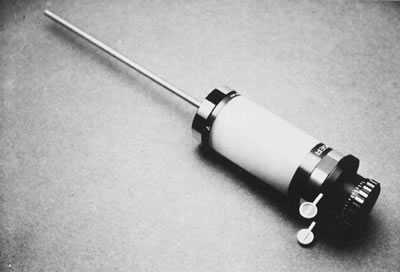 Contact hysteroscopy is an endoscopic technique that enables visualization of the uterine interior without distention of the uterine cavity, as is required with conventional hysteroscopy. In addition, the contact hysteroscope is free of external electrical connections and simply requires ambient light. From a historic perspective, the instrument used currently has evolved from a concept originally introduced by David in 1907.63 For approximately the past 10 years, this technique has been popularized by Parent and associates64,65 and Barbot66–69 in Europe, and by Baggish in the United States.67 Instrumentation The instrument currently available is shown diagrammatically in Figure 48. The hysteroscope consists of a light collector that gathers and transmits ambient light down a rod of optical glass that terminates in a mirror-type lens. The glass rod is enclosed in a stainless steel sheath. Light is transmitted and reflected by internal mirrors and lenses (see Fig. 48). The instrument is 200 mm long and is available in both 6- and 8-mm diameters. The eyepiece magnification is ×1.6, although an optional magnifying device allows the user an additional ×2 magnification. The assembled instrument is shown in Figure 49. The focal distance is 4 mm or less.