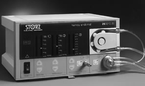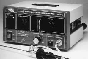To perform panoramic hysteroscopy, the uterine cavity, a virtual cavity, should be expanded with an appropriate distending medium. Because of the thickness and resistance of the uterine walls, distention requires positive pressure. Three media can be used: carbon dioxide (CO2) gas; low-viscosity fluids with or without electrolytes; and high-viscosity fluids, such as dextran. CO2 gas is the cleanest medium because its refractory index permits the best visualization when no interfering blood or bubbles are present. It is best used with small-caliber (outer diameter [OD] less than 5 mm) diagnostic hysteroscopes, which do not require cervical dilatation. The CO2 gas is delivered at a rate of 40 to 60 mL/min with an intrauterine pressure of no more than 100 mmHg (Fig. 1). These evaluations are usually performed in an office setting and usually can be accomplished in less than 5 minutes. With CO2 gas, any manipulation of the endometrium, including uterine sounding, should be avoided so as not to traumatize the tissue before exploration begins.