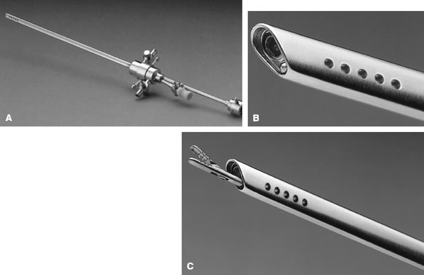 Additionally, because cervical dilatation is avoided, minimal or no anesthesia is required to perform hysteroscopic procedures in the office setting. Therefore, paracervical block anesthesia with 3 to 4 mL of a local anesthetic, such as chloroprocaine hydrochloride 1% (Nesacaine), will be sufficient to abolish any discomfort for the patient. Furthermore, the need for analgesia is also markedly reduced. Hysteroscopy can be performed using larger operative hysteroscopes (7-mm OD) under local anesthesia; however, with a paracervical block, the need for cervical dilatation requires a larger amount of anesthetic to be infiltrated superficially in the paracervical areas (base of the uterosacral ligaments) with 8 to 10 mL of the solution. In these situations, however, the procedures performed should be expedited and confined to minor surgical procedures. Extensive dissections or procedures using the resectoscope are better performed under regional, spinal, or general anesthesia. The resectoscope provides inflow and outflow channels by a mechanism of assembling two concentric sheaths of 8- to 9-mm OD. The rectoscope permits the use of electrodes such as the loop to resect, or the rollerball or rollerbar to coagulate; additionally, electrical knives are available to cut thick structures, such as uterine septa or adhesions (Figs. 9 and 10).