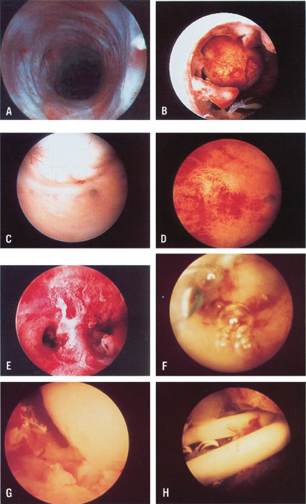 *15 patients refused additional procedures. † Some performed under fluoroscopy Vaucallie T, Schmidt EH: The uterotubal junction. A proposal for classifying its morphology as assessed with hysteroscopy. J Reprod Med 33:624, 1988 Impacted and Misplaced Intrauterine Foreign Bodies An intrauterine foreign body such as a forgotten intrauterine device (IUD) will interfere with fertility. This type of foreign body usually is detected by sonography, but fragments of a broken IUD may remain unnoticed. Additionally, bony fragments from previous late first-trimester or second-trimester abortions can remain in the uterine cavity or form osseous metaplasia acting as osteoblastic grafts. These formations can impair fertility by acting as a foreign body. Because blind removal of this type of foreign body is difficult, hysteroscopy is used to aid in proper complete removal. Patients will assume fertility following these procedures. It is important, nonetheless, to add sonography in the evaluation of these patients, should fragmented IUDs or bony fragments have penetrated the myometrium (see Color Plate 1J and K).45,46 Hysteroscopy and New Reproductive Technologies Hysteroscopy can be used as a platform to invade the fallopian tubes; it can be used for intratubal insemination and for delivery of gametes and zygotes, procedures that with refinements in technology may become simpler, less invasive alternatives to laparoscopy.47 The endometrial changes occurring throughout the menstrual cycle can be explored visually, with added magnification, and may eventually help to determine appropriate endometrial maturation and receptivity for embryo transfers.48 Similarly, the cumulative pregnancy rates in patients who had normal hysteroscopic examinations before embryo transfers seem to be significantly better than those in women in whom some abnormalities are detected. This suggests the need for better assessment of the uterine cavity before embryo transfers are performed.47,48 Hysteroscopy and Ectopic Gestations Evaluation of the patient with a possible ectopic pregnancy has been greatly facilitated by the use of quantitative human chorionic gonadotropin (hCG) titration and abdominal and vaginal ultrasound. Interest has arisen in using less invasive methods to treat ectopic pregnancies, particularly with methotrexate. This method requires systematic administration of the drug, and produces frequent side effects. Alternative methods of delivering the methotrexate locally used laparoscopic guidance, sonography, and blind tubal cannulations. The hysteroscope remains another alternative, particularly for pregnancies located at the proximal tubal openings and for confirming the pregnancy location determined by ultrasound. This approach may be expanded to include selected patients with early ectopic pregnancies, and women desirous of further fertility who have β-hCG levels of less than 1400 mLU/mL.49 Hysteroscopy can be useful in patients who have flattened or not decreasing levels of β-hCG; in patients in whom ultrasound does not provide information of the location of the pregnancy to rule out early threatening or incomplete abortions; and in determining the possibility of an ectopic gestation when the uterine cavity is completely normal.50 | |||||||||||||||||||||||||||||||||||||||||||||||||||||||||||||||||||||||||||||||||||||||||||||||||||||||||||||||||||||||||||||||||||||||||||||||||||||||||||||||||||||||||||||||||||||||||||||||||||||||||||||||||||||||||||||||||||||||||||||||||||||||||||||||||||||||||||||||||||||||||||||||||||||||||||||||||||||||||||||||||||||||||||||||||||||||||||||||||||||||||||||||||||||||||||||||||||||||||||||||||||||||||||||||||||||||||||||||||||||||||||||||||||||||||||||||||||||||||||||||||||||||||||||||||||||||||||||||||||||||||||||||||||||||||||||||||||||||||||||||||||||||||||||||||||||||||||||||||||||||||||||||||||||||||||||||||||||||||||||||||||||||||||||||||||||||||||||||||||||||||||||||||||||||||||||||||||||||||||||||||||||||||||||||||||||||||||||||||||||||||||||||||||||||||||||||||||||||