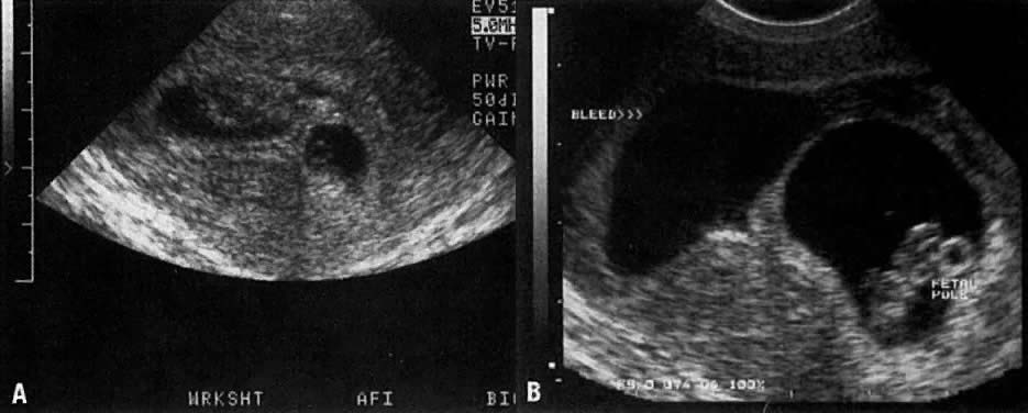 Approximately 15% to 20% of women have a spontaneous, clinically recognized pregnancy loss in the first trimester.5 Ball and co-workers6 found that a subchorionic bleed (identified on ultrasound) is associated with an increased risk of miscarriage, stillbirth, abruptio placentae, and preterm labor (Fig. 4A and Fig. 4B). Their data suggested that the risk of spontaneous abortion increased in proportion to an increase in the size of the subchorionic bleeds; however, a larger sample size was needed to determine statistical significance. Bradycardic fetal heart rates, small sac size, abnormal yolk sacs (Fig. 5), and large subchorionic bleeds have all been associated with an increased risk of first-trimester pregnancy loss.7