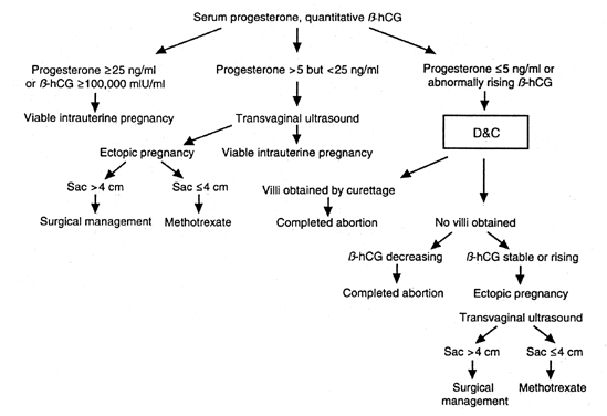 Although the pros and cons of the medical management of ectopic pregnancy with methotrexate are beyond the scope of this chapter, two points are worth making. First, LMP dating is off by at least 1 week 15% of the time. Failure to check serial titers can result in improper administration of methotrexate to patients with healthy pregnancies. Litigation has occurred in cases where methotrexate was inadvertently given to patients subsequently found to have an early intrauterine pregnancy. Second, methotrexate therapy for proven ectopic pregnancies appears to work best if the ectopic adnexal mass is less than 4 cm and the β-hCG titer less than 5000 mIU/ml. Pregnancies that do not meet these criteria are more likely either to require multiple doses of methotrexate or to be unresponsive to treatment. |