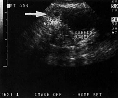 The sensitivity of TVS in detecting actual ectopic adnexal masses is probably dependent on both β-hCG levels and the skill of the sonographers. Stika and colleagues13 detected an ectopic adnexal mass only 13% of the time in patients with a mean pretreatment β-hCG level of 1900 mIU/ml. This compares with the findings of Stovall and co-workers,14 who visualized 94% of the ectopic adnexal masses in patients with a mean pretreatment β-hCG level of 3950 mIU/ml. Stovall and associates14 noted a fetal heartbeat in 12% of the ectopic pregnancies, compared to 23% in the study by Timor-Tritsch and colleagues.15 (Fig. 7) A large percentage of the time, identification of an ectopic adnexal mass is based on the findings of a tubal ring or complex adnexal mass (Fig. 8 and Fig. 9). The corpus luteum itself and hemoperitoneum secondary to it can lead to a false-positive diagnosis of ectopic pregnancy. In addition, the clinician should be aware that very small ectopic pregnancies identified on ultrasound may be difficult to identify laparoscopically.