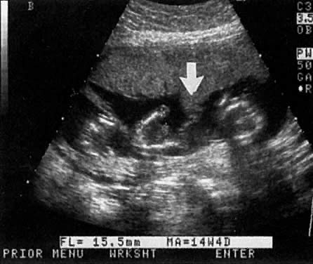 Major uterine anomalies are not infrequently diagnosed during the first-trimester ultrasound examination (Fig. 13 and Fig. 14). The bicornuate uterus is characterized by its widened transverse diameter and a notched fundus. The septated uterus has a normal uterine contour but a septated endometrial cavity.