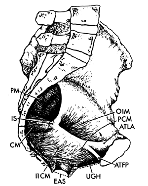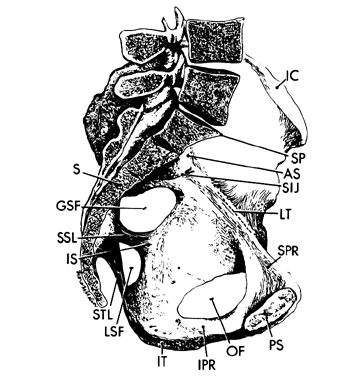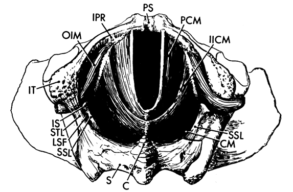 The pelvis has three joints: two sacroiliac joints and the pubic symphysis. The sacroiliac joints are true synovial joints, but the symphysis is a synchrondrosis, without a synovial space. Although immobile during most of life, these joints do display some movement during pregnancy. 1,2 Each hemipelvis contains three lateral openings in its wall. These are the obturator foramen and the greater and lesser sciatic foramina (see Fig. 2). The sacrospinous ligament separates the two sciatic foramina and has a broad attachment to the lateral surfaces of the lower sacrum and coccyx and an apical insertion into the ischial spine. It is covered on its pelvic surface by the coccygeus muscle (Fig.2 and Fig. 3). At the bottom of the lesser sciatic foramen is the sacrotuberous ligament. It arises from the posterior iliac spines and the back and side of the lower sacrum and coccyx and ends at the ischial tuberosity. These ligaments help to stabilize the pelvis and probably undergo the same softening that the ligaments around the pelvic articulations experience. Muscles of the Pelvis When a bony pelvis and model of a fetal head are used to demonstrate forceps delivery or mechanisms of labor there exists an obvious space between the fetal head and the osseous structures that is so large that the head can easily fall through the pelvic canal. This space is filled by the soft tissues of the pelvis. There are two components to these tissues. The first includes the muscles of the pelvic wall (Fig. 4), a series of muscles that cover the inner surfaces of the bony pelvis, following its shape and exerting their action on the hip. The second component is the pelvic floor, which supports the abdominal and pelvic viscera and whose resistance must be overcome by the presenting part during delivery. The pelvic floor consists of the pelvic diaphragm, which stretches across the entire pelvic cavity at the level of the midplane, and the urogenital diaphragm and external genital muscles, which span the anterior portion of the pelvic outlet.
