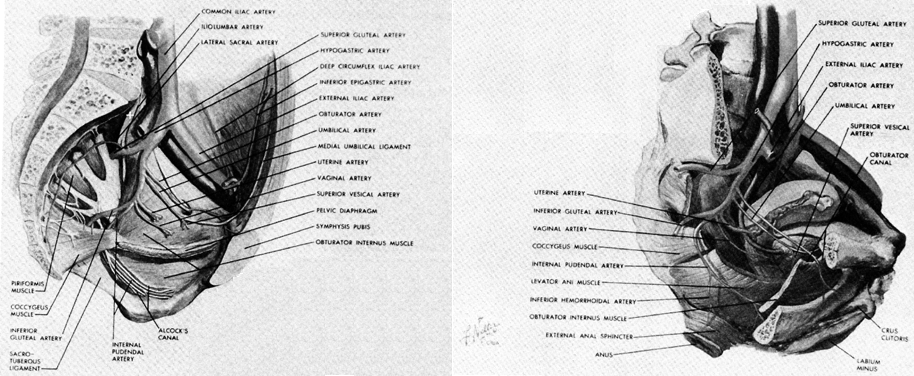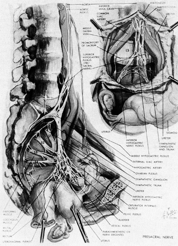 MUSCLES OF THE PELVIC WALL. Arising from the inner surface of the obturator foramen and membrane, the obturator internus muscle leaves the pelvis through the lesser sciatic foramen to insert into the medial surface of the greater trochanter. The piriformis muscle arises from the anterior aspect of the sacrum. It passes through the greater sciatic foramen and inserts into the upper border of the greater trochanter. The obturator internus muscle is innervated by the obturator nerve and the piriformis muscle is innervated by a branch from the sacral plexus. Both muscles are lateral rotators and abductors of the thigh. MUSCLES OF THE PELVIC DIAPHRAGM. The muscles of the pelvic wall do little to close off the opening in the pelvis. A fetal head would still fall through the pelvic opening were it not closed off by the pelvic diaphragm. There are three muscles in the pelvic diaphragm: the pubococcygeus, the iliococcygeus, and the coccygeus. The pubococcygeus muscle arises from the inner surface of each pubic bone to pass posteriorly on either side of the urethra, vagina, and rectum. Behind the rectum some fibers bend back anteriorly to join the muscle on the other side, thereby forming a sling. Other fibers insert into the sacrum and coccyx. Some of the most medial fibers within this group attach to the walls of the vagina and rectum. The iliococcygeus muscle arises from a series of tendon-like fibers that attach to the fascia of the obturator internus muscle (the arcus tendineus levator ani). From these broad origins the fibers of the iliococcygeus insert into the anococcygeal raphe and the coccyx. The coccygeus arises from the ischial spine and the sacrospinous ligament to insert into the borders of the coccyx and the lowest segment of the sacrum. These muscles are covered on their superior and inferior surfaces by the superior and inferior fasciae of the pelvic diaphragm. These fasciae arise from the obturator internus fascia and also in certain areas from the pubic bones. They fuse at the urogenital hiatus with the urogenital diaphragm and vagina. The iliococcygeus and coccygeus muscles receive their innervation from an anterior branch of the ventral rami of the third and fourth sacral nerves while the pubococcygeus muscle is supplied by the pudendal nerve. The muscle fibers of the pelvic diaphragm form a “U” with the open end directed anteriorly. The open area within the “U” through which the urethra, vagina, and rectum pass is called the urogenital hiatus. The normal tone of these muscles keep the base of the “U” pressed against the back of the pubic bones, squeezing the urethra, vagina, and rectum closed. During labor, this sling pulls the presenting part anteriorly once it has passed the midplane to assist in rotation. Blood Vessels of the Pelvic Wall The aorta lies on the lumbar spine slightly to the left of the vena cava, which it overlies (Fig. 5). Both the aorta and vena cava are subject to compression by the uterus in this location when a patient is supine. At the level of the fourth lumbar vertebra (on a line between the tops of the iliac crests) the aorta bifurcates into the left and right common iliac arteries. After about 5 cm the common iliac arteries give off the internal lilac artery from their medial side and continue toward the inguinal ligament as the external iliac artery. This division occurs in the area of the sacroiliac joint. The branching pattern of the internal iliac arteries and veins is extremely variable.3 A description of a common variant will be included here. The internal iliac artery supplies the viscera 9f the pelvis as well as many of the muscles of the pelvic wall and gluteal region. It usually divides into an anterior and posterior division 3 cm to 4 cm after leaving the common iliac artery. The vessels of the posterior division (the iliolumbar, lateral sacral, and superior gluteal) leave the internal iliac artery from its lateral surface to provide some of the blood supply to the pelvic wall and gluteal muscles. Trauma to these hidden vessels should be avoided during internal iliac artery ligation. The anterior division has both parietal and visceral branches. The obturator, internal pudendal, and inferior gluteal vessels primarily supply muscles, while the uterine, superior vesical, vaginal (inferior vesical), and middle rectal vessels supply the pelvic organs. The internal iliac veins begin lateral and posterior to the arteries and have a much more plexiform arrangement. Although the external iliac vein lies above the pelvic brim, the internal iliac vein crosses the linea terminalis. During obstructed labor, the internal iliac vein may be compressed for long periods of time, giving rise to the vulvar and pelvic soft tissue swelling seen in this situation. The legs, however, remain relatively uninvolved because of the external lilac vein's position above the true pelvis. Ligation of the internal iliac artery has proven to be helpful in the management of postpartum hemorrhage. Burchell's arteriographic studies have demonstrated that physiologically active anastomoses were immediately patent following ligation of the internal iliac artery and connected the following arteries of the internal iliac system with systemic blood vessels4: Internal iliac--Systemic (These were quite different than the anastomoses that had previously been hypothesized on purely anatomical grounds.) The lumbar arteries arise directly from the aorta; the middle sacral, again from the aorta; and the superior hemorrhoidal, from the inferior mesenteric. Further detailed anatomy of the internal iliac artery and its surgical exposure are covered in the first volume of this series (see Volume 1, Chapter 73, Surgical Management of Intractable Pelvic Hemorrhage). Nerves of the Pelvic Wall There are instances in which paralysis and numbness of the lower extremity occur following difficult vaginal delivery, which in some cases may be explained by nerve compression in the pelvis. 