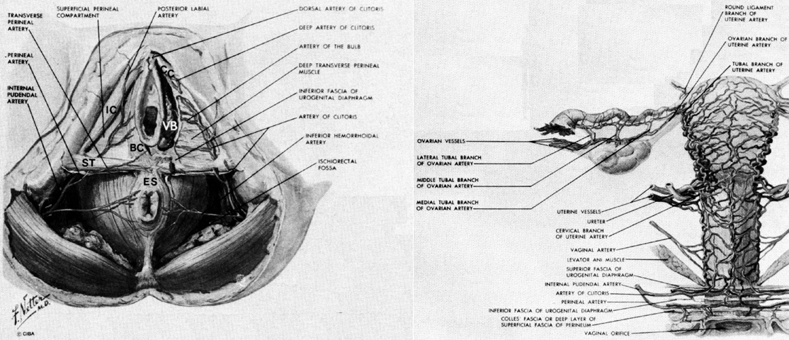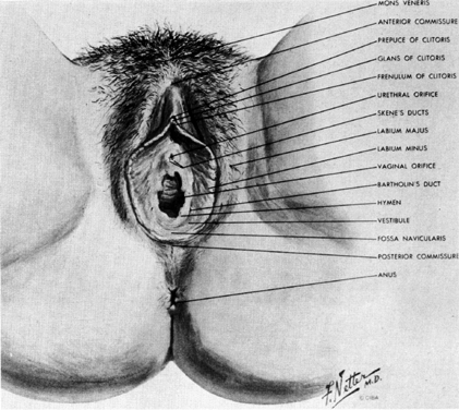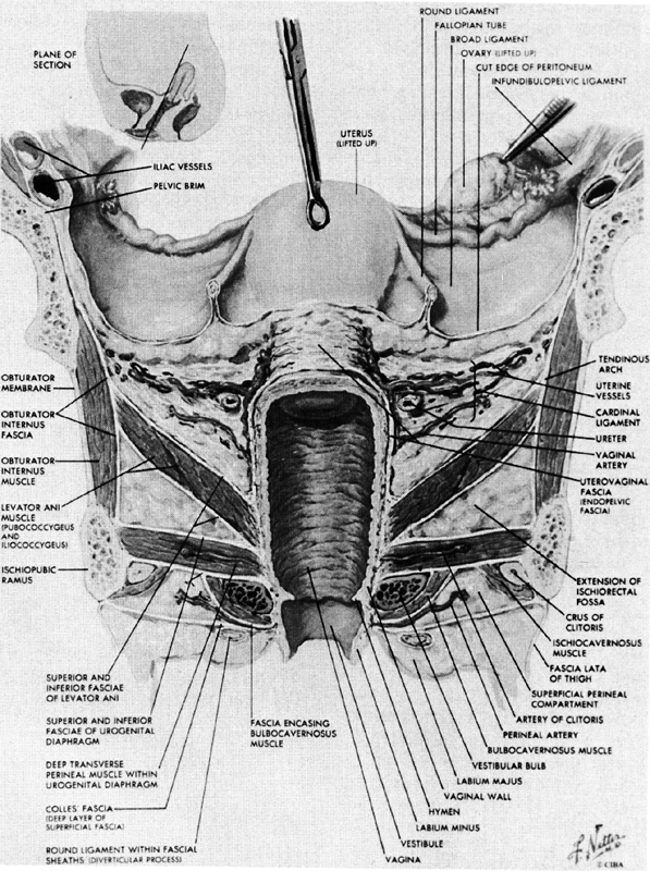The perineum (Fig. 6) is the second of the two components of the pelvic floor (the other being the pelvic diaphragm). The structures of the perineum lie below the pelvic diaphragm and are most easily viewed from below. The more superficial features of this region will be described first. External Genitalia The external genitalia of the female consist of the mons, labia, clitoris, and vestibule (Fig. 7). Anteriorly, the mons overlies the pubic bones and is composed of hair-bearing skin over a cushion of adipose tissue. Extending posteriorly from the mons, the labia majora are composed of similar hair-bearing skin and adipose tissue, which contain the termination of the round ligaments of the uterus and the obliterated processus vaginalis. Between the two labia majora the labia majora vestibule and glans clitoris can be seen. The labia minora are hairless skin folds. Anteriorly, each labium minus splits to run over, and under the glans of the clitoris. The more anterior folds unite to form the hood shaped prepuce of the clitoris, while the posterior folds insert into the under side of the glans as the frenulum. The area between the labia minora and surrounding the vagina is called the vestibule. Its moist squamous epithelium overlies the vestibular bulbs. In the posterior lateral aspect of the vestibule, the duct of the major vestibular gland can be seen 3 mm to 4 mm outside the hymenal ring. The minor vestibular glands can be found in a line parallel and just exterior to the hymen. The urethra protrudes slightly through the vestibular skin anterior to the vagina and posterior to the clitoris. The subcutaneous tissue underneath the skin, and superficial to the external genital muscles, consists of lobules of fat interlaced with connective tissue (see Fig. 6). The superficial layer of this tissue, where fat predominates, has been called Camper's fascia. In the deeper layers, there is less fat and the fibrous connective tissue strata between the lobules of fat are more evident. This fibrous layer is called Colle's fascia.7 Its fibrous strata are not actually a single layer as is often depicted, but they attach laterally to the ischiopubic rami and fuse posteriorly with the posterior edge of the urogenital diaphragm. These fibrous connections, which limit the spread of hematomas or infection in this deep compartment, gave rise to considering Colle's fascia as a separate entity from the superficial Camper's fascia, which lacks these connections. There is no attachment of Colle's fascia to the pubic bones anteriorly and fluid collections in this space may extend into the abdominal wall. Erectile Bodies and Associated Structures The erectile bodies and their associated muscles lie deep to the subcutaneous tissues of the vulva and are applied to the surface of the urogenital diaphragm (Fig. 6 and Fig. 8). The clitoris is composed of a midline shaft (body) capped with the glans. This shaft is suspended from the pubic bones by a subcutaneous suspensory ligament. The paired crura of the clitoris bend downward from the shaft and are firmly attached to the inferior aspects of the pubic rami. The ischiocavernosus muscles originate at the ischial tuberosities and the free surfaces of the crura, to insert on the upper crura and body of the clitoris. Contraction of these muscles pulls the shaft downward. There are a few muscle fibers that originate in common with the ischiocavernosus muscle and that run medially to the perineal body. These are called the superficial transverse perineus muscles. The paired vestibular bulbs are composed of erectile tissue and are applied to the undersurface of the vestibular skin and vaginal wall. They are covered by the bulbocavernosus muscles that originate in the perineal body and lie over their lateral surfaces. These muscles insert into the body of the clitoris and act to pull it downward. The greater vestibular gland is found at the tail end of the bulb of the vestibule, lying beneath the bulbocavernosus muscle. Urogenital Diaphragm There is a triangular sheet of dense musculofascial tissue that spans the anterior half of the pelvic outlet. Rather than forming an uninterrupted sheet in the female, as it does in the male, the urogenital diaphragm attaches the vagina and perineal body to the anterior bony outlet (see Fig. 6). This layer arises from the inner aspect of the inferior ischiopubic rami above the ischiocavernosus muscles and the crura of the clitoris. The medial attachments of the urogenital diaphragm are to the walls of the vagina and to the perineal body. Within the substance of the urogenital diaphragm, there is skeletal muscle, called the deep transversus perineus. It is never as well developed as many illustrations would imply.8 The primary function of the urogenital diaphragm in relation to obstetrics has to do with its attachment to the vagina and perineal body. By attaching these structures to the pelvic bones, their descent is limited during the great downward pressure that is exerted on the vagina and perineum during the second stage of labor. If these attachments remain intact after parturition, they will contribute to the normal support of the vaginal outlet. If torn or detached from the vagina and perineal body, then the pelvic floor sags and the introitus gapes. Ischiorectal Fossa There is an ischiorectal fossa that lies on either side of the rectum and vagina (see Fig. 6 and Fig. 8). It is a wedge-shaped space whose base is formed by the perineal skin. The apex of the wedge is formed by the junction of the pelvic diaphragm and the obturator internus muscle. Anteriorly, there is a recess of the ischiorectal fossa above the urogenital diaphragm. Posteriorly, it extends as far as the fat that lies under the gluteus maximus muscle. In the area above the urogenital diaphragm, the fat of the ischiorectal fossa is separated from the vaginal wall by the pelvic diaphragm. Therefore, when the fat of the anterior recess of the ischiorectal fossa is seen i