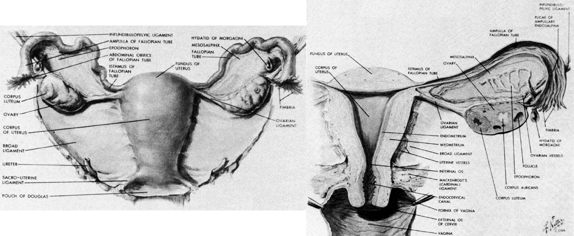 The term ligament is most familiar when it describes a dense connective tissue band that links two bones, but it also describes structures that support various viscera. There is great diversity among the ligaments of the uterus and its adnexal structures (see Fig. 10). Although they share a common designation, they are composed of many types of tissue and have different functions. The broad ligaments are primarily peritoneal folds that extend laterally from the uterus to end on the pelvic wall. They have several specialized areas. The main sheet of tissue extending on either side of the uterus where there is anterior peritoneum on posterior peritoneum is called the mesometrium. Below it are the cardinal ligaments and at its upper border are the mesovarium and mesosalpinx. At the lateral end of the ovary and extending upward the ovarian vessels raise a ridge of peritoneum from the lateral pelvic wall. This ridge and its contained vessels are called the suspensory ligament of the ovary or the infundibulopelvic ligament. At the other end of the ovary, connecting it to the uterus is the ovarian ligament, which is a fibromuscular structure separate from the vascular pedicle. At the lower end of the uterus, somewhat above the external os, two fibromuscular bands called the uterosacral ligaments run from the posterolateral aspects of the cervix to the presacral connective tissue over the second, third, and fourth sacral vertebrae. They lie on either side of the pouch of Douglas and are composed of smooth muscle, nerves, and connective tissue.36 These ligaments hold the cervix posteriorly in the pelvis over the pelvic diaphragm. They do not undergo as much hypertrophy in pregnancy as the round ligaments do and probably have no significant role in labor. The round ligaments are extensions of the uterine musculature. They begin as broad bands that arise on the lateral aspect of the anterior corpus. They assume a more rounded shape before they enter the retroperitoneal tissue where they pass lateral to the deep inferior epigastric vessels and enter the internal inguinal ring. After traversing the inguinal canal, they exit the external ring and distribute to the subcutaneous tissue of the labia majora. These ligaments undergo significant hypertrophy during pregnancy and have sufficient bulk to make the contention that they help pull the uterus forward during contractions plausible. The cardinal ligaments lie at the lower edge of the broad ligaments, between their peritoneal leaves. They run from the lateral pelvic walls to the lateral edges of the cervix and the upper third of the vagina. Although when placed under tension they feel like ligamentous bands, they are composed simply of the vascular and neural elements that supply the uterus and vagina.37 These structures have considerable strength, and the lack of a separate “ligamentous band” in this area does not detract from their supportive role. They not only provide support to the cervix and uterus but also support the upper portion of the vagina to keep these structures positioned over the pelvic diaphragm away from the urogenital hiatus. When a parturient pushes before the cervix is completely dilated, the descent of the uterus causes the blood vessels, nerves, and connective tissue of the cardinal ligament as well as the fibromuscular tissue of the uterosacral ligament to become taut so that they retard the downward movement of the cervix. Some damage to these structures may occur as a result of this set of circumstances, and if the pelvic floor is also damaged, there appears to be an increased chance in later life that genital prolapse will develop. |