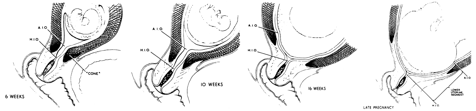 The way in which these changes occur, however, is not readily apparent. The growth that occurs in the substance of the uterus itself occurs during the first half of gestation. During the first 5 months of pregnancy the uterus grows faster than the conceptus so that it is only during the middle of pregnancy that the conceptus actually catches up with the growth of the uterus to fill the uterine cavity, as will be seen when the development of the isthmus of the cervix is considered. There are three phases of uterine growth23: hyperplasia, which occurs before nidation; hypertrophy, which happens during the first half of pregnancy; and dilation, which occurs during the second half of pregnancy. During the first and early second trimesters of pregnancy, the mass of the uterus increases in a fairly linear fashion to the full weight that it will be at term. This means that although the external dimensions of the uterus will continue to enlarge during the second half of pregnancy, the uterus will not gain additional tissue. The wall of the uterus, therefore, thickens or remains a constant thickness in the first half of pregnancy but becomes thinner as it must stretch to surround a growing fetus later on. In contrast to the uterus, which has achieved its full weight by the middle of the second trimester, at this same time the fetus has only undergone one sixth of the total growth that it will achieve by term. Lower Uterine Segment The lower uterine segment is that portion of the myometrium that must dilate during the process of delivery in order to allow the presenting part to deliver (Fig. 12). The tissue that will make up the lower uterine segment begins as a part of the cervix, and as pregnancy progresses, it comes to lie in the lower portion of the corpus. It goes through several stages of development. The division between the muscular uterine wall and the fibrous cervix is not always at the internal os of the cervix. In the nonpregnant and early pregnant uterus the line of demarcation between the fibrous and muscular parts of the uterus actually occurs below the anatomical internal os of the uterus (see Fig. 12, “6 weeks”). Early in pregnancy the relatively small conceptus occupies a portion of a large uterus. At about the 16th week, fetal growth catches up with uterine growth so that the products of conception fill the entire uterine cavity. The continued fetal growth past the time when uterine hypertrophy has ceased stretches the uterine wall,24 as evidenced by the thinning of the muscular wall of the corpus (see Fig. 11). As this stretching increases, the muscular portion of the cervix is placed under tension and, having little collagenous tissue to resist this force, opens as far as the musculofibrous junction. As pregnancy progresses the lower uterine segment begins to develop as a clinically distinctive entity at about 34 weeks' gestation, roughly the same time that Braxton-Hicks contractions become clinically evident.25 At this time the increasing tension of this tissue causes it to widen and therefore becomes proportionately thinner. This widening of the lower uterine segment is responsible for two clinical phenomena. First, it explains the apparent upward migration of a low lying placenta during the latter phases of pregnancy as the lower uterine segment between the placenta and cervix widens. Second, with a placenta that is implanted in the lower uterine segment, stretching of this area may cause shearing between the unyielding placenta and the placental bed, which changes as the lower uterine segment develops. This phenomenon explains the fact that patients with placenta previa begin to bleed at about 34 weeks' gestation when the lower uterine segment begins to develop. The lower uterine segment is also that portion of the corpus that must dilate during parturition, thinning as the muscle of the corpus shortens and thickens.26 This implies that the muscle in this area is less able to contract than the muscle of the upper part of the uterus. Because it is thin and avascular, this part of the uterus makes it a good location for cesarean section incisions. The dilation of the cervix enhances the primarily transverse orientation of the fibers in this area, thereby creating little tension on the closure line. Innervation of the Uterus and Adnexa The uterus receives its nerve supply from the uterovaginal plexus (Frankenhauser's ganglion), which lies in the connective tissue of the cardinal ligament (Fig. 13).27 This local condensation of nerve fibers is a part of a larger plexus of nerves--the pelvic (inferior hypogastric) plexus, which also supplies the bladder and rectum. The adnexal structures receive their innervation from nerve fibers coursing along the ovarian blood vessels. These latter fibers are derived primarily from the tenth thoracic segment. The uterovaginal plexus contains fibers that are derived from two sources. It receives sympathetic and sensory fibers from the tenth thoracic through the first lumbar spinal cord segments. These nerves travel through the superior hypogastric plexus along the inferior hypogastric nerve to reach the pelvic (inferior hypogastric) plexus. The second input comes from the second, third, and fourth sacral segments and consists primarily of parasympathetic nerves, which reach the pelvic plexus through the nervi erigentes. Clinically there appear to be no significant afferent fibers from the uterus and cervix in these sacral nerves.28 These anatomical facts explain several clinical observations. Injection of anesthetic agents into the paracervical tissues, transection of the superior hypogastric plexus (presacral neurectomy), and segmental blockade of the tenth thoracic through first lumbar spinal nerves all are effective in alleviating the pain of uterine contraction and cervical dilation, while low caudal or saddle anesthesia that blocks the sacral segments is not. The autonomic nervous system modulates the smooth muscle contractions of mo