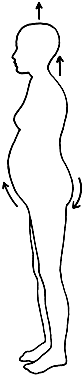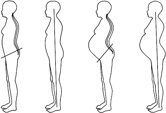 As humans evolved to an upright posture, several points of structural weakness were created in the human body. These are further accentuated during pregnancy; potential problem areas are the vertebral column, the abdominal muscles, and the pelvic floor. The vertebral column in the normal state has curves to counteract the forces that gravity exerts on the upright posture. The curves of the spine include a concavity in the cervical area, convexity in the thoracic region, concavity in the lumbar vertebrae, and convexity in the sacrum. The line of gravity passes through the mastoid of the skull, the shoulder, and the hip and knee joints to just anterior to the lateral malleolus. The pelvis lies at an angle of 65 degrees to the lumbar spine, and the pelvic angle determines the prominence of the abdomen and buttocks (Fig. 1). In the nonpregnant state, connective tissue is responsible for the tensile strength of major fascial structures, ligaments, and joints and is able to withstand all extra physical effort. There is evidence to suggest that changes in connective tissue due to the hormonal effects of increased progesterone and relaxin during pregnancy reduce support and permit increased mobility in structures to which muscles and tendons are attached.17,18,24,36 Examples include softening of the cervix, mobility of the symphysis pubis, and relaxation of the joints of the pelvis and lower back, especially the sacroiliac joints. Because of these changes and greater joint mobility, there is less stability of the hip and knee joints, which often causing discomfort and loss of balance. For these reasons, jerky, bouncing movements, quick turns, and jogging, which can cause additional strain and pain, should be avoided.22 Abdominal fascia loosens due to hormonal effects early in pregnancy (long before the uterus is large enough to account for enlargement of the abdomen), thus allowing for greater stretching of the abdominal muscles. Generally, there is contact between the 2 rectus abdominis muscles below the umbilicus and 2 cm between these muscles above the umbilicus. With widening of the linea alba in pregnancy, a diastasis can occur in 28% of pregnancies in the second trimester; its incidence peaks in third trimester and remains high in the immediate postpartum. The diastasis results in a bulge of the abdominal wall on increase in intraabdominal pressure and a separation of a distance of more than two finger-widths between the rectae.18,23,27 To evaluate this condition, the patient lays with her knees bent while the physician or midwife places his or her fingers below the xiphoid across the linea alba. The patient raises her head and shoulders off table while the physician moves his or her fingers distally to determine how many fingers fit into the space between the 2 rectus abdominus muscle bellies.27 If diastasis is present, the patient is advised to perform the “curl-up” exercise daily by tilting the pelvis posteriorly, supporting the rectae muscles on either side with her hands, and exhaling while lifting her head.22,23 Together with the downward pull of the gluteal muscles, the upward pull of the abdominals maintains the correct alignment of the pelvis in relation to the vertebral column. If these muscles are well toned, they adequately support the enlarged uterus during pregnancy. More frequently, there is increased lumbar lordosis. Because of joint changes, some physicians believe that impairment of coordination of the larger movements and an increase in reaction time are also evident in pregnancy. Therefore, many advise against activities in which safety depends on precise coordination and instant responses, such as skiing.19,20 Increased body weight is directly related to postural changes in the thoracic and abdominal regions. With increase in weight during pregnancy (11.4–15.9 kg [25–35 lb] normally), the abdominal muscles are stretched, there is protuberance of the uterus anteriorly, and the line of gravity is shifted forward. To maintain her balance, the woman stands farther back on her heels and increases the width of her base. This accentuates the lordosis in the lumbar spine, causing the pelvis to tilt at a more acute angle to the vertebral column (see Fig. 1). Structural changes, weight redistribution, and hormonal alteration of joint stability put additional strain on the sacroiliac and hip joints. The muscles of the lower back are shortened under the increased work load, resulting in frequent backache and fatigue. The extra effort required to balance causes hyperextension of the knees and weight on the inner borders of the feet, resulting in the “waddling” gait of pregnancy, foot strain, and additional fatigue.35 Compensation for this altered body alignment occurs in the upper back and neck region, with kyphosis, or rounding, of the shoulders and forward protrusion of the head. The rounding of the shoulders is further compounded by the additional 0.7 kg (1.5 lb) of weight in the breasts in preparation for lactation. This results in shortening of the pectoral muscles, added tension in the shoulders, and stretching of the rhomboid muscles, producing complaints of pain in the upper back between the scapulae. The protruded position of the head further alters postural sense, which must be relearned.38 Head position also impacts on the nerves emerging from the cervical spine and often results in traction on the median and ulnar nerves, which is experienced as numbness, tingling, and pain in the hands and arms.36 Increased vascularity and fluid retention may also contribute to these symptoms.24 With the encroaching uterus putting pressure on the diaphragm in the seventh to ninth months of pregnancy, many women experience shortness of breath. The poor postural alignment described previously further compresses the lungs from above, decreasing lung capacity. Postural Correction Poor posture and some shortening of the hip flexor muscle group secondary to anterior rotation of t