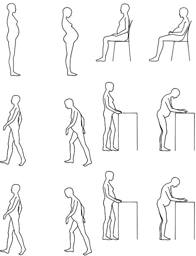 In everyday living, many people do not use good body mechanics and as a result put strain on muscles, ligaments, and joints while performing daily chores. In pregnancy, this strain is increased, whether sitting, standing, or walking (Fig. 13), and the patient frequently needs re-education to maintain body alignment without undue strain or pressure.
