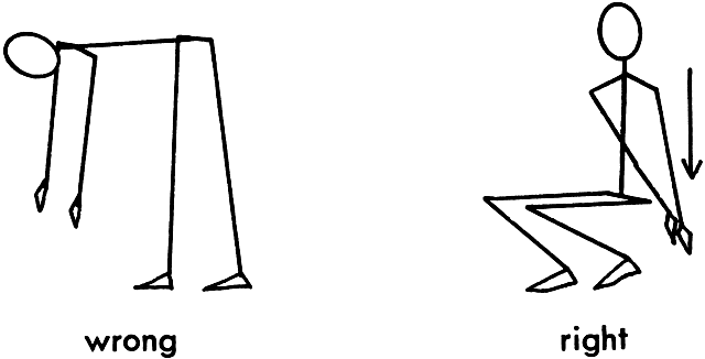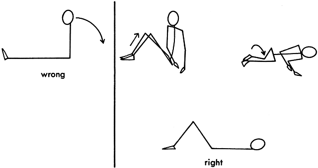The following exercises can be easily shown to the patient by her physician. In particular, the first one can be demonstrated to the patient when she comes for her prenatal visits. In changing from sitting on the examining table to a lying position, many women lie straight back, putting severe strain on the abdominal muscles and joints of the back. The office nurse or physician can correct this by telling the patient to bend her knees, roll to one side, lower her body using her arms, and then roll to her back (Fig. 14). Changing from lying to sitting positions is frequently done incorrectly by “jackknifing up,” which strains the already stretched abdominal muscles, causes further separation of the recti, and results in backache. The change should be made slowly to avoid dizziness. Again, the patient bends her knees, rolls to one side, and raises her body by pushing up on her hands. To pick up objects from the floor, the patient should squat by bending her knees while keeping her back straight and then lift the object by straightening the knees rather than bending from the waist; this method reduces back strain, tones the muscles of the thighs, and affords better weight distribution (Fig. 15). While climbing stairs and doing household chores, the patient should use her legs as much as possible and avoid flexion of the back.