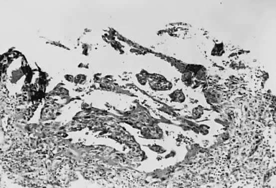 The trophoblast has two layers: the cytotrophoblast and the syncytiotrophoblast. Syncytiotrophoblast is formed from the underlying cytotrophoblast. In the first part of pregnancy, these two layers usually are quite distinct on microscopic examination and can be used to date a placenta or pregnancy. Fetal vessels with nucleated fetal red blood cells appear at 21 days' gestation. Thus, the presence of both trophoblast cell layers in the absence of vessels indicates a pregnancy of <21 days. Fetal vessels and red blood cells, along with two cell layers of trophoblast, indicate a pregnancy of 21 days to 5 months (see Fig. 3). After the fifth month of pregnancy, the cytotrophoblast, when viewed under a light microscope, appears to degenerate. Electron microscopic studies have revealed that although the cytotrophoblast becomes thinner, it remains throughout pregnancy, and all syncytial cells formed during the latter half of pregnancy are formed from cytotrophoblast, as in the first portion of gestation. The apparent absence of cytotrophoblast signifies a pregnancy beyond 5 months (Fig. 7). Toward term, the mesenchymal core of each villus becomes more dense and compact, and the fetal vessels appear to be much closer to the overlying syncytiotrophoblast, possibly facilitating transfer of nutrients or waste products. These changes, combined with fibrin deposition within the intervillous space and occasional syncytial knots, are characteristic of a term placenta. At term, the human placenta weighs approximately 500 g.