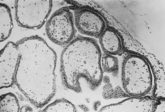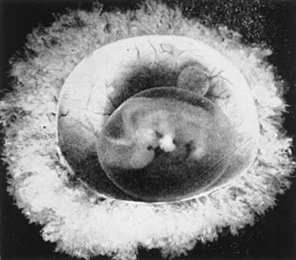 Venous sinuses within the endometrium are invaded very early by trophoblast cells. Lacunae surrounded by syncytial cells and filled with maternal venous blood and tissue fluid develop within a few days. Villi first become recognizable on the 12th day of development, when the solid layer of invading trophoblast is penetrated by a mesenchymal core, presumably derived from cytotrophoblast, to form secondary villi. Maternal spiral arterioles are eroded on the 14th or 15th day, and maternal arterial blood enters the developing intervillous space. Fetal vessels are formed in situ within the mesenchymal cores, and the resulting villi are called tertiary villi. By approximately the 17th day following conception, both fetal and maternal blood vessels are functioning, and true placental circulation is established. Meanwhile, the endometrium, under the influence of estrogen and progesterone, has undergone striking changes in preparation for implantation. Stromal cells have become enlarged and pale staining and are surrounded by edema fluid; gland cells are filled with glycogen. This endometrium, called decidua because it sheds at the end of the pregnancy, is arranged into three layers: a compact surface layer with few glands, a spongy middle layer with many glands and vessels, and a basal layer. The blastocyst invades to and develops within the spongy layer. The decidua covering the blastocyst 2 to 3 days after implantation is called the decidua capsularis. The decidua of the remainder of the cavity of the uterus is called the decidua parietalis. When the enlarging embryo finally completely fills the endometrial cavity during the third or fourth month of pregnancy, the decidua capsularis fuses with the decidua parietalis opposite it and obliterates the endometrial cavity. Villi are distributed over the entire chorionic membrane, giving the ovum a grossly shaggy appearance (Fig. 2). The villi in contact with the decidua basalis proliferate to form the chorion frondosum, which is the fetal component of the placenta, whereas those in relation to the decidua capsularis cease to grow; the latter undergo almost complete degeneration by the end of the fourth month of pregnancy and form the chorion laeve. Occasionally, remnants of villi can be seen clinging to its surface with a few shreds of decidua. The developing embryo is oriented so that its ectodermal or dorsal surface is in contact with the decidua basalis, and it is on this surface that the amniotic cavity first begins to appear. The amniotic cavity probably is formed by a split in the chorion just over the developing ectoderm and neural ridge. It fills with fluid and rapidly expands to surround the entire embryo, obliterating the space between it and the chorion by the end of the third month. On the ventral surface of the embryo, a yolk sac and an allantoic sac are formed, each with vessels and ducts connected to the future caudal end of the embryo through the body stalk. The vessels to the allantoic sac become the umbilical vessels and join with newly formed vessels in the mesenchyme of the inner surface of the chorion to form the fetal portion of the vessels to the placenta. The body stalk becomes the umbilical cord and is covered with amnion. The yolk sac never completely develops; after providing endoderm to form the primitive gut and the primordial germ cells which migrate to the mesonephric folds (i.e. genital ridges) to develop into the gonads, it atrophies relatively quickly. It occasionally can be found as a small vesicle within the fetal surface of the placenta next to the insertion of the cord. Fetal and maternal vascularization of the placenta is complete by the 17th to 20th day, and nucleated fetal red blood cells can be found within the fetal vessels after the 21st day following conception (Fig. 3). The placenta continues to grow in thickness and circumference until the end of the fourth month. Increased thickness of the placenta is the result of growth in the length and size of the villi of the chorion frondosum, with accompanying expansion of the intervillous space. After the fourth month there is no appreciable increase in thickness, but growth in circumference continues through most of pregnancy. Further fetal development is discussed elsewhere in this text.