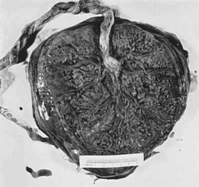 When viewed from the fetal surface, the placenta is a flat, smooth disk with the umbilical cord entering perpendicularly near its center. Fetal vessels radiate from the umbilical cord between the amnion and chorion like the spokes of a wheel (Fig. 5). The membranes on the surface of the placenta are continuous at its margin with the chorion and amnion lining the remainder of the uterine cavity.
