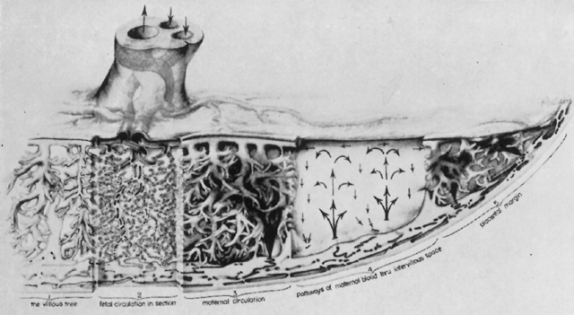 The maternal surface of the placenta usually appears to have several major divisions. Each of these contains several fetal cotyledons (see Fig. 4). The grooves or depressions in the maternal surface of the placenta are formed by decidual septa that help anchor the placenta and limit the lateral flow of blood within the intervillous space. Between these septa, several spiral arterioles empty directly into the intervillous space. Each spiral arteriole has several venous sinuses associated with it to provide venous return to the maternal circulation. There are no maternal end-arterioles or end-capillaries (Fig. 6). Maternal blood enters the intervillous space in jets or spurts from the spiral arterioles and continues under the force of maternal blood pressure to the chorionic plate. The blood then is deflected laterally, forming the shape of a doughnut with each spurt, and flows back toward the decidua basalis, bathing the small villi as it does so; it is then drained off by maternal venous sinuses. Older theories held that all the arterial input to the placenta was carried laterally to a large marginal sinus which drained into maternal veins. Although there may be relatively more blood at the margin of the placenta, there apparently is no true marginal sinus. Blood entering through spiral arterioles near the center of the placenta does not have to traverse half the placenta to find maternal veins. This organization of the placenta continues throughout pregnancy. Villi continue to proliferate and develop until term. As term approaches, there may be degeneration of some villi, piling up of fibrinlike material between the villi, and, sometimes, heaping up of syncytial cells to form syncytial knots. However, the functional portion of the placenta continues to proliferate and grow as pregnancy progresses. |