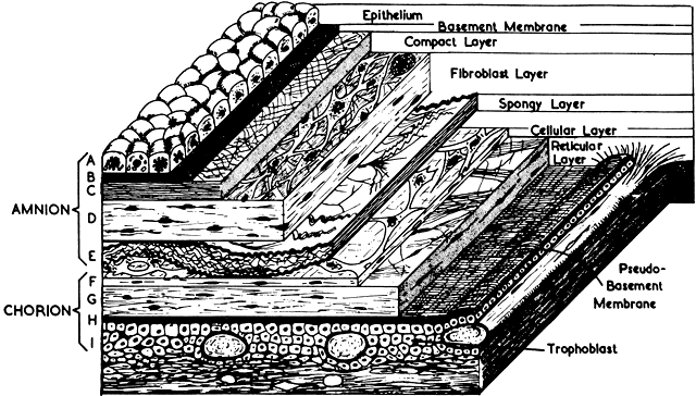 The amnion forms from splitting of the cytotrophoblast. Its inner layer becomes epithelial, and mesenchymal cells develop on its outer surface. By the end of the third month of pregnancy, the amnion has expanded to obliterate the yolk sac, the allantoic sac, and the extracoelomic space within the chorion. It fuses with the mesenchyme on the inner surface of the chorion. The two membranes appear as one, although they usually are easily separable at any time thereafter (Fig. 8). The endometrial cavity has been obliterated by the fourth month of pregnancy, allowing the fused membranes to be in contact with the decidua parietalis throughout the uterus. Amniotic fluid volume at term is approximately 1000 ml, with a turnover rate of 500 ml/hour. The fetus floats freely within the amniotic sac connected to the placenta and the mother by the umbilical cord, which contains two arteries and one vein. The right umbilical vein disappears relatively early in the human, leaving only the single left vein.