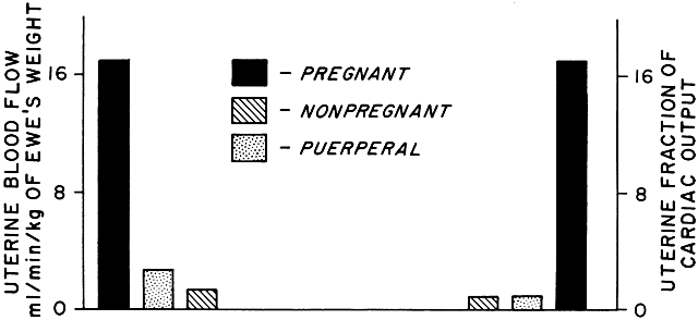 * Figures represent mean ± 1 SE of several readings taken in the control period after surgery has been completed. † Expressed as per kilogram of ewe's weight. (Dilts PV jr, Brinkman CR III, Kirschbaum TH et al: Uterine and systemic hemodynamic interrelationships and their response to hypoxia. Am J Obstet Gynecol 103:138, 1969) TABLE 2. Maternal and Fetal Placental Blood Flows During the Last Third