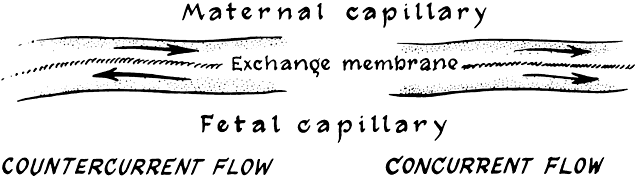 * Values are ml/min/kg fetus † Values are ml/min/kg uterus The fetal placental circulation receives approximately two thirds of the total fetal cardiac output. Some representative measurements of umbilical blood flow are listed in Table 2. This high flow rate is important in the transport of oxygen and nutrients from mother to fetus and is maintained by a number of anatomic differences in the fetal circulation. Because the fetal lungs do not have any respiratory function, a high vascular resistance is maintained in this organ by the mechanical effects of the unexpanded alveoli on the vessel walls and the vasoconstrictive effect of the low oxygen tension that prevails in the fetal blood. These two factors combine to shunt approximately two thirds of the right ventricular output away from the lungs toward the systemic circulation through the ductus arteriosus, which is maintained patent by the same low oxygen tension that keeps the pulmonary vessels constricted. With the large right-to-left shunt, a high cardiac output (almost twice that of the mother) is created, providing for a high flow rate across the placental exchange membranes. The controversy over the existence of shunts in the maternal and fetal placental circulations stems, at least in part, from the inconstant use of the word shunt.16 If a maternal shunt is defined as that fraction of the uterine blood flow that does not supply an area where exchange between maternal blood and fetal blood takes place, about 84% of the uterine blood flow during the last third of gestation is placental blood flow in most animals. However, the actual maternal shunt may be greater than the nonplacental blood flow if there are additional shunts in the placental or preplacental vessels. A fetal shunt may be defined as the fraction of the umbilical blood flow that does not supply an area where exchange between fetal blood and maternal blood takes place. In sheep, it has been demonstrated that during the last third of gestation about 6% of the umbilical flow was not placental flow but that which perfused the intercotyledonary chorion. We cannot assume, however, that this value applies to other species, including primates, because of morphologic differences. As is true with the uterine circulation, the actual shunt in the umbilical circulation may be even greater if there are also shunts within the placenta. Regulation of Placental Blood Flows One must consider first whether the pressure in the surrounding tissue and the adjacent circulation plays a role in the regulation of either the maternal or the fetal placental blood flow. During labor, uterine contractions grossly impair maternal placental blood flow, presumably by distortion or occlusion of the preplacental vessels.2 Whether or not mechanical factors play a role in flow regulation before labor, however, is open to question. If anywhere along a vessel there is an external “surrounding pressure” that is greater than the intravascular pressure, the vessel will collapse at that site. Driving pressure under these conditions is the difference between arterial pressure and the surrounding pressure. Flow under these circumstances is called sluice flow.16 With this type of flow, increased uterine vein pressure could result in impedance of the umbilical circulation. Sluice flow has been observed in the umbilical circulation only in artificially perfused placental preparations. Intact, unanesthetized fetal lambs have yielded no evidence that umbilical vascular resistance was affected by changes in uterine venous pressure. In species with hemochorial villous placentas in which the maternal blood flows in the intervillous space surrounding the fetal villi, sluice flow appears to be anatomically possible, but as yet there is no physiologic evidence for it. An important question is whether the uteroplacental circulation is able to autoregulate. Autoregulation is generally defined as the ability of an organ to adjust its vascular resistance by local control mechanisms in the face of changing perfusion pressure.17 Thus, the effects of changes in perfusion pressure are minimized, and blood flow remains constant. From the standpoint of the fetus, autoregulation in the uteroplacental circulation would seem to be essential. Studies in pregnant sheep, however, indicate that uterine blood flow varies directly proportionally with mean arterial pressure and have failed to demonstrate a system of autoregulation. The presence of autoregulation mechanisms has been suggested by the maintenance of a constant flow rate over a wide range of pressures in pregnant rabbits and pregnant rhesus monkeys, but the evidence is not conclusive. Maternal regulation of uterine and placental blood flows does not appear to be strong.18 The degree of autonomic innervation to the uterine vasculature during pregnancy varies widely from species to species. Both adrenergic and cholinergic sympathetic fibers are found in the uteri of most animals. Sacral nervous influences may be involved in the maintenance of a high uterine blood flow rate in those species that possess cholinergic innervation (e.g. uterine nerve stimulation in the pregnant guinea pig causes uterine vasodilation). Adrenergic fibers are present in the uterus of all animals studied, but histologic examination reveals that pregnancy causes the complete disappearance of these fibers in the myometrium and a great reduction in their numbers around the uterine blood vessels. Nevertheless, electrical stimulation of the sympathetic chain in term pregnant sheep and dogs results in increased uterine vascular resistance and decreased uterine blood flow. There are a number of chemical factors that are vasoactive in the uteroplacental circulation. The results of older studies in anesthetized pregnant sheep seemed to indicate that hypoxia could increase as well as decrease uterine blood flow, but experiments with conscious animals have failed to show any appreciable effect of maternal hypox