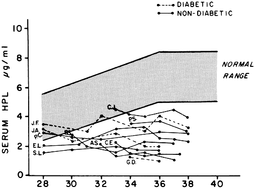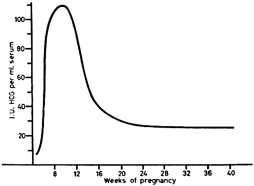 The function of hCG is confusing. Corpus luteum function definitely is prolonged by the action of hCG. However, many studies have shown that bilateral oophorectomy may be performed in the first few weeks of pregnancy with no ill effects. hCG concentrations reach a peak at a time when the hormone no longer is needed. hCG stimulates placental estrogen production, but there is no evidence that it is necessary for it. Small amounts of hCG reach the fetus and may play a role in the early development of steroid synthesis in the fetal adrenal and testes. It has been found that hCG inhibits the in vitro lymphocyte-stimulating effect of phytohemagglutinin. This has been interpreted by some as indicating a partial suppression of immunity and as affording a means by which the fetus, which is immunologically foreign because of inherited paternal antigens, avoids rejection as a foreign body. However, there is little other supportive evidence for these speculations. hPL is a single polypeptide chain with a molecular weight of approximately 20,000. It is similar to human growth hormone; about 80% of the amino acid residues are identical in the two molecules. The term human placental lactogen, like the term human chorionic gonadotropin, applies to biologic activity rather than to the hormone itself. hPL is produced by the trophoblast. It disappears from maternal serum within a few hours after delivery of the placenta. Immunofluorescence studies localize hPL in the syncytiotrophoblast; polysomes and messenger RNA isolated from the syncytiotrophoblast tissue and incubated in vitro have synthesized hPL. The regulation of hPL synthesis also remains an enigma. In general, the amount of hPL formed is related to placental size, but other factors, such as ionic environment and nutrient variables, may also contribute. It is of interest that rapid intravenous infusion of glucose decreases hPL, whereas intravenous arginine raises plasma hPL levels. hPL secretion may be regulated to some extent by some placental factor analogous to the hypothalamic factor controlling growth hormone release by the pituitary. hPL has lactogenic activity in animals and puerperal humans and luteotrophic action in the rat. There has been some evidence that it has growth hormone-like activity; it may potentiate the ability of growth hormone to cause growth of the tibial epiphyses in hypophysectomized rats. Evidence of its growth hormone-like activity is limited, however, and is subject to question. hPL has also been shown to suppress the in vitro phytohemagglutinin-induced lymphocyte response, but the significance of this phenomenon is not clear. Small amounts of hPL do appear to reach the fetus, although the role of this hormone, if any, in fetal development is unknown. hPL has been used as an index of placental and therefore fetal well-being, because concentrations in plasma rise as term approaches (Fig. 12). Other protein hormones have been reported to be produced in the placenta: human chorionic thyrotropin (hCT), human chorionic follicle-stimulating hormone (hCFSH), and human chorionic corticotropin (hCC). Like hCG and hPL, they are named for their biologic activity and are similar to their counterparts produced in the pituitary. Their functions in pregnancy are unknown. STEROID HORMONES. During pregnancy, there is a gradual increase in the urinary excretion of progestins and estrogens. This change in steroid metabolism with gestation is secondary to the biosynthesis of steroid hormones by the placenta and fetus. Three estrogens are produced by the placenta: estrone, 17β-estradiol, and estriol (Fig. 13). The primary evidence for their production by the placenta is the fact that placental fragments incubated in vitro synthesize estrogens from neutral C-19 steroids. The fetus and placenta must be present for the production of the large amounts of maternal estrogen normally found in serum and urine during pregnancy; thus, the term fetoplacental unit was coined. The placenta aromatizes the androgens dehydroepiandrosterone, androstenedione, and testosterone, produced by the fetus, to estrogens. This process takes place in the placental microsomes and is catalyzed by cytochrome P-450. The synthesis of estrogen is known to be stimulated by hCG and hPL, and the placenta may regulate its own estrogen synthesis.