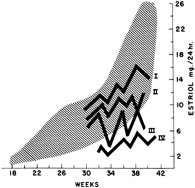The function of the elevated estrogen level during pregnancy is unknown, except that it seems to stimulate growth of the uterus, particularly the myometrium and its vascular supply, as well as the breasts. However, the elevated levels of estrogen, which rise progressively to term, form the basis for the best clinical test available for assessing fetoplacental well-being. Most of the estrogens formed are excreted in the urine bound to glucuronate or sulfate. Excreted estrogens are estriol, 80%; estrone, 15%; and estradiol, 5%. In the biosynthesis of estriol, one of the steps, 16α-hydroxylation, takes place only in the fetal adrenal gland. Therefore, absence of the fetal adrenal gland (as in anencephaly) or chronic maternal illness causing fetoplacental deprivation lowers the amount of estriol, and thus total estrogen, excreted in maternal urine. Maternal 24-hour urinary estriol excretion is a valuable screening test for fetal well-being in patients with diabetes mellitus, chronic renal disease, and hypertension (Fig. 14). It is also helpful in estimating fetal maturity. Progesterone is also synthesized in large amounts by the placenta, using maternal blood cholesterol as the principal substrate, whereas the fetus contributes very little to the total progesterone production. Progesterone and its metabolites (Fig. 15) are found in maternal serum and urine as long as the placenta is in situ and functioning. Near term, the human placenta produces about 250 mg of progesterone daily, of which about 75 mg are delivered to the fetus for adrenal biosynthesis of steroid hormones. The mechanism regulating progesterone synthesis is unknown. Pregnanediol is the primary urinary excretion product; however, it is unreliable as proof of progesterone level, because it can also be derived from other sources such as deoxycorticosterone.