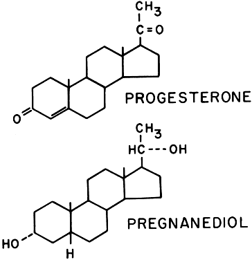 The function of progesterone is unclear. It apparently aids in ovum transport through the fallopian tube and definitely prepares the endometrium for implantation. However, these events happen before progesterone levels begin to rise during pregnancy. Progesterone inhibits uterine muscle contractility and may have a major role in blocking the onset of labor. Progesterone promotes gland development in the breast and has an antialdosterone effect on the kidney. Normal levels fluctuate so much that this action is of questionable importance. Urinary pregnanediol levels have been used in the clinical assessment of pregnancy but are less reliable than estriol levels. | ||||||||||||||||||||||||||||||||||||||||||||||||||||||||||||||||||||||||||||||||||||||||||||||||||||||||||||||||||||||||||||||||||||||||||||||||||||||||||||||||||||||||||||||||||||||||||||||||||||||||||||||||||||||||||||||||||||||||||||||||||