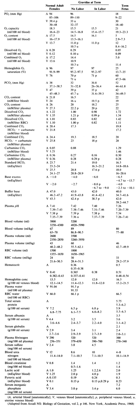 The function of the human placenta is of interest from both a scientific and a clinical point of view. Unfortunately, in vivo study of the human placenta is very difficult because the methodology carries with it unacceptable risks to both mother and fetus. Therefore, most of our knowledge about the function of the placenta has been derived from animal models. The placentas of higher primates are morphologically most comparable to that of humans. Suitable primates, however, are small, with even smaller fetuses. They have little tolerance for indwelling catheters and often abort or deliver prematurely after intrauterine surgery. In addition, these animals are prohibitively expensive and thus have not been used extensively. Placental exchange has most thoroughly been studied in the rabbit, guinea pig, and rat. The ultrastructure of their placental barriers is comparable to that of the human (i.e. hemochorial placenta). The most widely used of all laboratory animals in this regard, however, is the sheep. Pregnant ewes are of comparable size to humans, with equally large fetuses that tolerate intrauterine surgery well. The exchange barrier (i.e. epitheliochorial placenta) is quite unlike that of the human, however. There is no good evidence that the placenta hemodynamics of the sheep are comparable to those in humans; however, there is also little evidence to the contrary. Placentas have three functions: the exchange of nutrient and waste materials between mother and fetus, the manufacture and secretion of hormones, and the maintenance of an immunologic barrier. Only the exchange function and the hormone function of the placental barrier are discussed in detail in this chapter. Because the exchange function is so dependent on the rates of maternal and fetal placental blood flows, we must first discuss placental hemodynamics. Hemodynamics The placenta is the only organ in the body with two separate blood supplies, each coming from a separate organism. We have already discussed the morphologic organization and ultrastructure of these two circulations. Because the placenta is a transient organ and the blood flows change rapidly with each stage of pregnancy, we know less about the regulation of these blood flows than we do about the regulation of the blood flow to any other organ in the body. The uteroplacental circulation is a low-resistance system for the maternal organism. Resistance to blood flow is defined as the ratio of the driving pressure and flow, where the driving pressure is the difference between the central arterial pressure and the venous outflow pressure. There is some question regarding the validity of using central arterial pressure in the calculation of the driving pressure, however, because direct measurement of mean pressures in the preplacental arteries of animals with hemochorial placentas have been found to be approximately 8% to 20% of the mean central arterial pressures. These findings indicate that the physiologic regulation of maternal placental blood flow may be complex and may depend on an arterial resistance to flow at a site outside the organ itself. As a low-resistance system, the uteroplacental circulation is responsible for, or at least contributes to, marked changes in maternal cardiovascular physiology. Uterine arterial blood flow in the nonpregnant state averages 1% to 2% of the maternal cardiac output. During pregnancy, uterine blood flow rises markedly until at term it accounts for as much as 17% of the maternal cardiac output (Table 1; Fig. 9). Some representative measurements of uteroplacental blood flow are listed in Table 2. Maternal cardiac output per se increases 35% to 40% during pregnancy.15 Heart rate also increases but does so disproportionately with cardiac output, resulting in a significant increase in stroke volume. There is a slight fall in mean arterial pressure resulting from a significant decrease in systemic vascular resistance; this reflects not only the development of the low-resistance uteroplacental vascular bed but also generalized systemic vasodilation. This explains the necessity of the 30% to 40% expansion in blood volume associated with normal pregnancy to maintain blood flow to other organs. Other maternal physiologic adaptations to pregnancy are described elsewhere in this text. TABLE 1. Hemodynamic Values in Pregnant, Nonpregnant, and Puerperal Animals