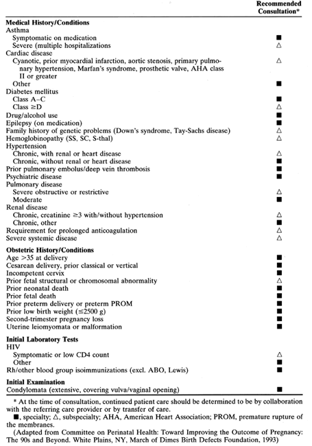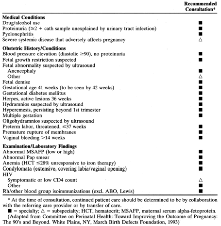 Consistent with the goals of regional coordination, improved pregnancy outcomes have been associated with risk identification, care in a setting appropriate for the level of risk, and transfer to an appropriate facility when necessary. Specifically, premature and low-birth-weight infants born in subspecialty care hospitals have better survival rates, even after controlling for interhospital differences in birth-weight distribution, race, gestational age, and multiple births. The greatest impact has been in reducing the mortality of neonates weighing less than 1500 g at birth. Although the reported incidence of low birth weight and very low birth weight in the United States is higher than in at least a dozen other industrialized nations, the birth-weight-specific survival rates among infants in this country are among the best in the world. This phenomenon has been attributed to the technologically advanced care provided to newborns through regionalized inpatient services. A regionally coordinated system focusing on levels of hospital-based perinatal care has been shown to be effective, resulting in improved outcomes for mothers and newborns. Such a system can be extended to encompass preconception evaluation and early pregnancy risk assessment in both an ambulatory and hospital-based setting. The recommendations by the Committee on Perinatal Health1 emphasize early recognition and triage of potential prenatal problems before pregnancy or in the early prenatal period. Based on the level of care provided, functional capabilities of providers are defined, and those capabilities are related to inpatient maternal and neonatal needs. The overall goals for regional coordination of ambulatory prenatal care are (1) to ensure appropriate care for all women, (2) to make better use of available resources, and (3) to improve the outcome of pregnancy. By defining provider capabilities and expertise, and by ensuring that pregnant women receive risk-appropriate care, this system enables prenatal care to be delivered more effectively and efficiently. Developments in maternal-fetal risk assessment and diagnosis, as well as interventions to change maternal behavior, make early and continuous prenatal care more effective in improving pregnancy outcome. Risk-responsive prenatal care may call upon the services of many kinds of providers within a perinatal region. The responsibilities and the degree of intensity of prenatal care should be proportional to the degree of risk and the potential for intervention. All providers of prenatal care should be able to identify a full range of medical and psychosocial risks and to refer patients for appropriate care throughout pregnancy. They should place greater emphasis on early prenatal risk assessment, with appropriate referral and consultation among providers of basic, specialty, and subspecialty levels of prenatal care. Early and ongoing risk assessment should become a universal component of maternity care. Depending on individual patient circumstances and the expertise of the individual provider, additional consultation may or may not be needed (Table 1A and Table 1B). TABLE 1A. Early Pregnancy Identification for Consultation ![]() TABLE 1B. Ongoing Pregnancy Risk Identification for Consultation ![]() Comprehensive risk assessment enables the prenatal care provider to determine whether the woman, the fetus, or the infant is at increased risk. Risk factors are characteristics that indicate the possibility of adverse outcome and help guide actions by the woman, her social support network, and her advisors. Because of the dynamic nature of pregnancy, risk assessment must be an ongoing activity throughout prenatal care and at the time of birth. Risk identification should entail the development of a specific plan of care, as well as arrangements for referral and consultation. The content and timing of prenatal care should vary depending on the risk status of the mother and fetus. The use of a standardized (i.e., common) prenatal record (see Appendix1 among public and private providers within a perinatal region will greatly facilitate communication, thereby enabling continuity of care and enhancing risk assessment and intervention activities. The primary goals of early and ongoing risk assessment are to prevent or treat conditions associated with morbidity and mortality and to improve linkages to inpatient care through more effective referral and consultation mechanisms. Overall, standardization of data collection and recording, as well as early systematic risk assessment, will accomplish the following: