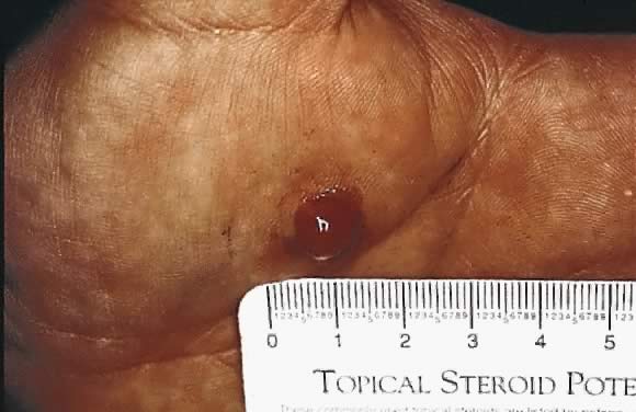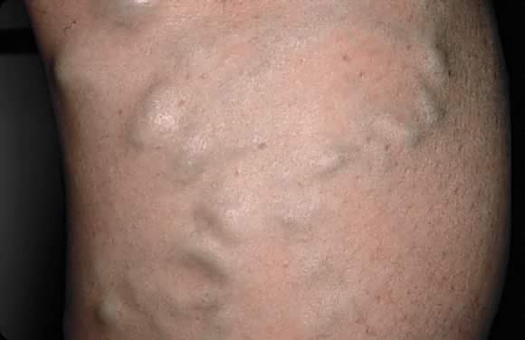 The vascular changes seen in pregnancy are greatly influenced by changes in maternal hormones such as human chorionic gonadotropin (hCG), adrenocorticotrophic hormone (ACTH)-like substance, thyrotropin-releasing hormone, and estrogen. These hormones result in an increase in cardiac output, vascular proliferation, congestion, and vasomotor instability (Table 1).1,6,7 TABLE 1. Vascular Changes in Pregnancy Spider nevi Spider Nevi Spider nevi are bright red, blanchable, small arterioles with fine vessels radiating from the center. They are typically seen at the end of the first trimester and gradually increase in size throughout pregnancy. These are mainly seen on the skin drained by the superior vena cava, particularly around the eyes (Fig. 2). Fair-skinned individuals have a higher incidence than African Americans (67% vs 11%, respectively). Most spider nevi regress postpartum, but a small percentage persist and require treatment with electrocautery or laser.3 Palmar Erythema Palmar erythema is a mottled erythema of the thenar and hypothenar eminences with sparing of the digits. It is seen in two thirds of pregnancies during the first trimester and resolves postpartum. Palmar erythema is also seen in other conditions such as lupus erythematosus, cirrhosis, and hyperthyroidism, indicating a possible role of increased estrogen levels as a common cause.1 Varicosities Increased distention in the superficial venous vasculature of legs (i.e. varicose veins), vagina, vestibule (i.e. Jacquemier-Chadwick sign), and rectum (i.e. hemorrhoids) are common in pregnancy. About 40% of pregnant women are affected. Hormonal factors and increased intraabdominal pressure play a role. Elevation of the legs and lying in Trendelenburg position help to decrease varicose veins. Varicose veins usually regress in the postpartum period; however, in severe cases, surgical intervention may be necessary (Fig. 3). The small, spider-like telangiectasias are often unresponsive to electrocautery and require sclerotherapy (i.e. intravascular injection of sclerosing agents such as sodium tetradecyl sulfate) or laser therapy. Hemorrhoids are often treated with stool softeners, topical antiinflammatory agents, and in severe cases, injection of sclerosing agents or rubber band ligation.1,3 Granuloma Gravidarum or Pyogenic Granuloma Granuloma gravidarum is a benign, rapidly proliferating vascular lesion that commonly occurs at sites of previous trauma on the face, neck, and digits (Fig. 4). Pregnancy, irritation, and increased estrogen levels are predisposing factors. Although postpartum regression is common, surgical removal followed by electrodessication may be required.8