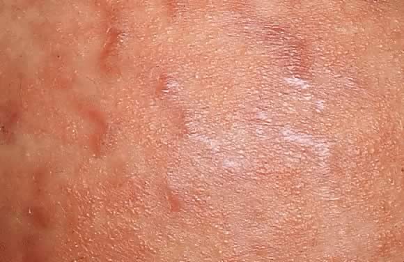 Striae Gravidarum Striae gravidarum, or “stretch marks,” occur commonly on the abdomen, thighs, and buttocks of pregnant women. These appear as atrophic, wrinkled, erythematous, purplish bands that fade over time (Fig. 6). Striae occur in 90% of fair-skinned individuals, usually in the third trimester of pregnancy, and they are less common in African American and Asian persons. Pathogenesis of striae formation is unclear. Proposed hypotheses include increased lateral stress on connective tissue and increased glucocorticoid levels due to elevated adrenocortical activity.1 Currently, there is no effective treatment for striae. Treatment options such as dietary supplements, topical low-dose tretinoin, or laser therapy with the flashlamp-pumped pulsed dye laser postpregnancy are of limited benefit.
