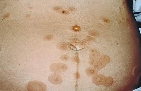 Polymorphic Eruption of Pregnancy Polymorphic eruption of pregnancy (PEP) was first described by Lawley in 197912A as pruritic urticarial papules and plaques of pregnancy (PUPPP). Both PEP and PUPPP are terms that are interchangeably used, with PEP being preferred in the current literature. PEP is the most common of the dermatoses unique to pregnancy, with an incidence of 1 in 160. Seventy-five to eighty-five percent of cases occur in primigravidas, who experience an abrupt pruritic onset in the third trimester of pregnancy, most commonly in the 35th to 39th week of gestation or immediately postpartum.13 The eruption begins on the abdomen along the striae distensae, sparing the umbilical and immediate periumbilical area (Figs. 7 and 8).14 This is in contrast to pemphigoid gestationis, in which the majority of cases arise in the umbilical area. PEP may spread to the thighs, buttocks, and extremities, but facial involvement is rare. As the name implies, the skin manifestations are quite variable. These include vesicular, target-like, annular or polycyclic papules or plaques that become confluent over time (Figs. 9 and 10). In a recent study by Aronson and colleagues, three categories were defined15: type I, urticarial papules and plaques; type II, nonurticarial erythema, papules, or vesicles; and type III, a combination of types I and II. The cause of PEP is unknown. One proposed theory is the rapid stretching of the skin late in pregnancy; this hypothesis is supported by the initial presentation of the eruption along the striae distensae. Increased maternal and newborn weight gain lends support to this theory; there is a higher incidence of PEP in twin pregnancies.14,16,17