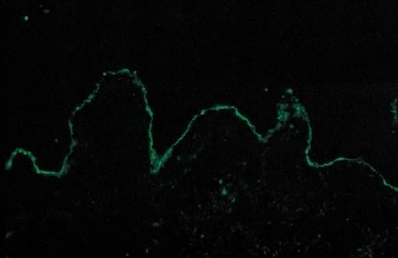 Accurate diagnosis is crucial in light of the variable clinical course of this disorder. Spontaneous resolution over weeks to months postpartum is a common finding. About 75% of cases of PG present with flares immediately postpartum. Recurrence in subsequent pregnancies with an earlier onset and more severe clinical course is a common feature. Disease-free pregnancies (i.e. “skip pregnancies”) with no cutaneous involvement in patients with a history of PG have also been reported in the literature. There have also been reports of PG flares occurring with menstruation and use of oral contraceptives (25% of cases).20,21 PG is an autoimmune disorder caused by aberrant expression of the MHC II class antigen on the chorionic villi of the placenta which triggers an allogenic response to the placental basement membrane zone and subsequent cross-reaction with maternal skin through the maternal decidua.22,23 There are reports of occurrence of PG in association with hydatidiform mole and choriocarcinoma.24,25 Association of PG with other autoimmune diseases such as Graves' disease has also been reported.26 Studies also show an increased incidence in HLA DR3 and DR4. HLA DR3 occurs in the same percentage of white persons as in African American persons; however, the percentage of DR4 is lower in African Americans, and this may explain the rarity of PG in this population.27 Dermatopathology of PG shows subepidermal vesicle formation with focal necrosis of keratinocytes. The dermis shows papillary edema and a perivascular infiltrate consisting mainly of eosinophils and few lymphocytes. An occasional finding on histopathology is the alignment of eosinophils along the dermoepidermal junction. DIF shows a characteristic linear band of C3 along the skin basement membrane zone of patients with PG (Fig. 14). Linear C3 deposition on DIF is diagnostic of PG in the correct clinical setting and is used to differentiate PEP from PG.28 Using this method, about 25% of cases also present with IgG deposits along the basement membrane zone. Indirect immunofluorescence (IIF) demonstrates the “PG factor,” which consists of circulating IgG complement-fixing anti-basement membrane zone antibodies in serum of patients with PG. Complement-activated IIF using monoclonal antibodies directed against IgG1 demonstrates this factor in all PG patients.29 Clinically, titers of PG factor do not correlate with disease severity. The PG factor is an IgG directed against a 180-kd hemidesmosomal (transmembrane) component of the basement membrane zone.30 Electron microscopy also demonstrates the C3 and IgG deposits in the lamina lucida.31
