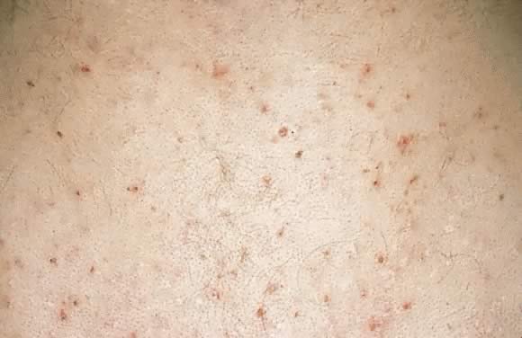 Papular Dermatitis of Pregnancy Papular dermatitis of pregnancy was initially described by Spangler in 196243 as a generalized papular erythematous and pruritic eruption with central crust. The distribution is on the abdomen with spread to the extremities. An increased level of urine hCG and a decrease in the urinary estriol level, in combination with a significant increase in fetal morbidity and mortality, was initially described. Many believe that papular dermatitis of pregnancy and prurigo of pregnancy are similar entities. Histopathology and DIF findings are similar. The high fetal risk initially reported by Spangler43 has not been reproducible in other studies.44 Pruritic Folliculitis of Pregnancy Pruritic folliculitis of pregnancy was first described by Zoberman and Farmer in 1981.45 Onset of eruption most commonly occurs in the second or third trimester of pregnancy as small erythematous papules around follicles. The eruption is typically monomorphic with distribution on the trunk and extremities (Fig. 18). Histopathology resembles a folliculitis, and the DIF is negative. Differential diagnosis involves papular dermatitis or steroidinduced acne. The fetus is unaffected, and the treatment is topical benzoyl peroxide.2,45